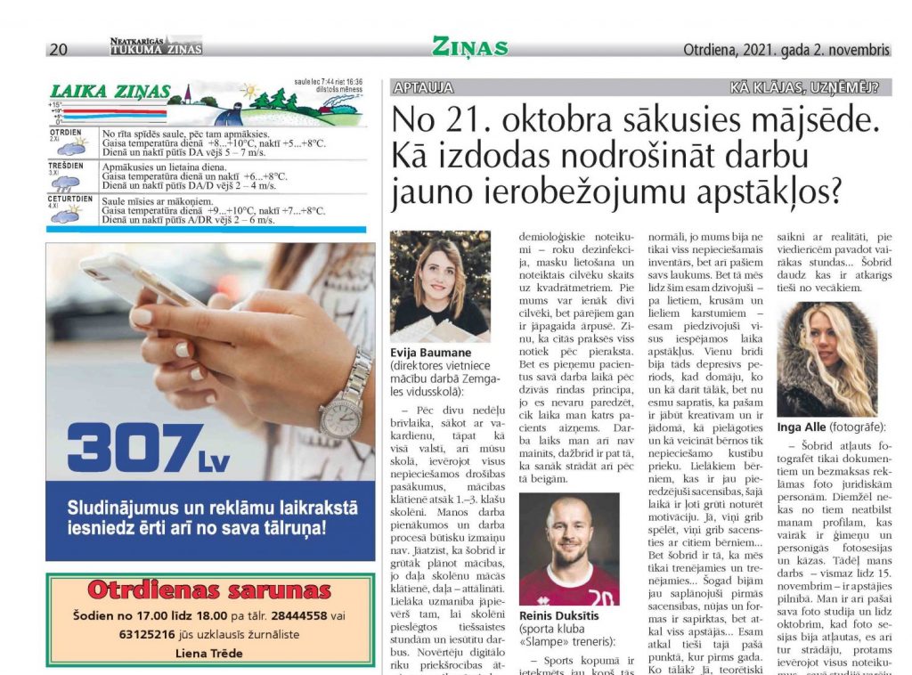 – Šobrīd atļauts fotografēt tikai dokumentiem un bezmaksas reklāmas foto juridiskām personām. Diemžēl nekas no tiem neatbilst manam profilam, kas vairāk ir ģimeņu un personīgās fotosesijas un kāzas. Tādēļ mans darbs – vismaz līdz 15. novembrim – ir apstājies pilnībā. Man ir arī pašai sava foto studija un līdz oktobrim, kad foto sesijas bija atļautas, es arī tur strādāju, protams ievērojot visus noteikumus – savā studijā varēju uzņemt divus cilvēkus. Jā, vasarā viss notika ārā un es ierobežojumus neizjutu. Arī rudens bija darba pilns – līdz pat oktobrim, kad viss tika aizvērts. Bija jūtams, ka cilvēki ļoti grib izrauties no visa un iemūžināt mirkļus… Es jau saprotu, ka daudzus mēnešus viss bija slēgts, cilvēki pat Ziemassvētkus nebija paspējuši iemūžināt, tad nu tagad ķēra momentu. Arī es pēc ierobežojumiem atsāku stādāt tikai jūnijā. Ko tagad? Pieņemu jau pasūtījumus uz Ziemassvētku foto sesijām, bet es jau nevaru nemaz pateikt, vai tas būs iespējams. Jo, diemžēl, ņemot vērā augstos saslimstības rādītājus,… iespējams, ka nebūs mums labvēlīga scenārija.
