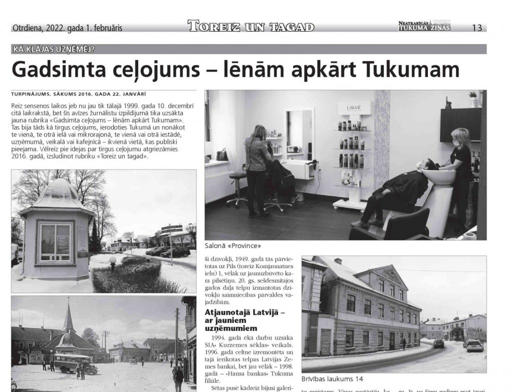 Un nu devāmies lūkot, kas šajā ēkā notiek šodien. Fasādes krāsa – rozā, kam savs šarms, jo te iekārtojies skaistumkopšanas saloniņš. Jau daudzus gadus šīs ēkas skatlogos var lasīt, ka te atrodas matu kopšanas produktu firmas Lakme salons, ar nosaukumu «Province». Jā, pirms pavisam neilga laiciņa, salonam bija arī kaimiņi – firmas apavu un apģērbu veikals «Astor Outlet», nu tas pārcēlies uz pretējo ielas pusi, kurā gan jau iegriezīsimies kādu citu reizi. Devāmies iekšā salonā, jo jau caur logu pamanījām, ka tur aktīvi strādā divas frizierītes. Pie durvīm, kā jau pieklājas – aprakstīti visi noteikumi, kas jāievēro šajā epidemioloģiski nedrošajā laikā. Jāpiebilst, ka ne tikai latviešu valodā, bet arī klienti to var lasīt angļu un krievu valodās. Ieejot sasveicinājāmies, un, drošā attālumā stāvot, uzrunājām matu meistares. Viņas pastāstīja, ka friziera pakalpojumus šajās telpās saviem klientiem sniedz jau septīto gadu. Šobrīd strādājot trīs frizierītes – Inga Kalvāne, Lina Robate, Kristiāna Zēberga, kā arī manikīre, pedikīre un uzacu meistare – Ludmila Kulažinska. Esot brīva telpa kosmetologam, tādēļ, ja kāds meklējot iespēju strādāt, lai droši nākot un runājot.