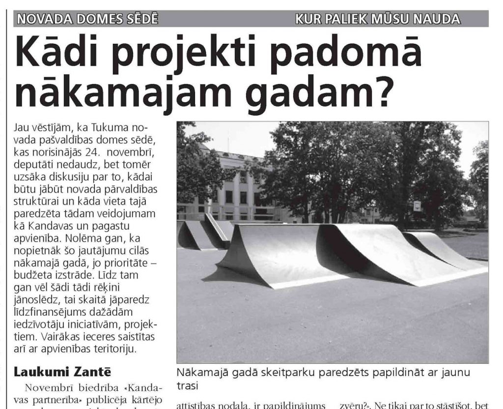 Vēl viens projekts, ko jau minētājā konkursā iesniegšanai gatavos attīstības nodaļa, ir papildinājums skeitparkam, kas atrodas iepretim jaunieši centram «Nagla», Zīļu ielā, Kandavā. Jāpiebilst, ka iepriekšējais projekts noslēdzās šī gada aprīlī, un tā ietvaros tika nomainītas esošās iekārtas, piemēram, rampas, kas jau bija savu nokalpojušas, kā arī papildus uzstādīt jauni objekti. Nu paredzēts izbūvēt vēl tā saukto «Pump truck» trasi, kas būtībā ir asfaltēts uzkalniņu un nogāžu celiņš, uz kura trenēties. Te kopējās izmaksas tiek lēstas 47 000 eiro apmērā, no kurām attiecināmās izmaksas jeb tā summa, kurai var prasīt ES fondu atbalstu, ir vien 15 000 eiro (atbalsts būtu 90% no šīs summas). Attiecīgi lielāko izdevumu daļu jeb 33 500 eiro, ko gan varētu precizēt pēc iepirkuma procedūras, jebkurā gadījumā nāktos segt pašvaldībai. Deputāti deva zaļos gaismu arī šim projektam, summu paredzot nākamā gada budžetā, un, kā nojaušams, komiteju sēdēs deputāti arī sprieduši, ko darīt, ja konkursā projekts akceptu tomēr negūst…