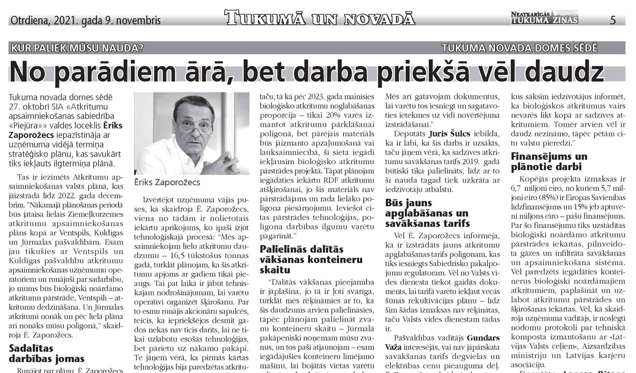 Vēl domes sēdē Ē. Zaporožecs informēja, ka 20. oktobrī Centrālā finanšu un līgumu aģentūra bija aicinājusi uzņēmumu iesniegt projektu bioloģiski noārdāmo atkritumu sistēmas ieviešanai. “Projekts jāiesniedz līdz 22. novembrim, pēc tam tas tiks vērtēts. Šis mūsu uzņēmumam ir jau trešais uzaicinājums piedalīties šajā programmā, bet iepriekš pieteikties nevarējām sliktās finansiālās situācijas dēļ. Tagad esam kaujas gatavībā piedalīties. Ja mūsu sagatavoto ieceri atbalstīs, 2022. gadā varēsim sākt organizēt iepirkumus projekta izstrādei un pēc tam – iekārtu iegādei,” tā valdes loceklis.