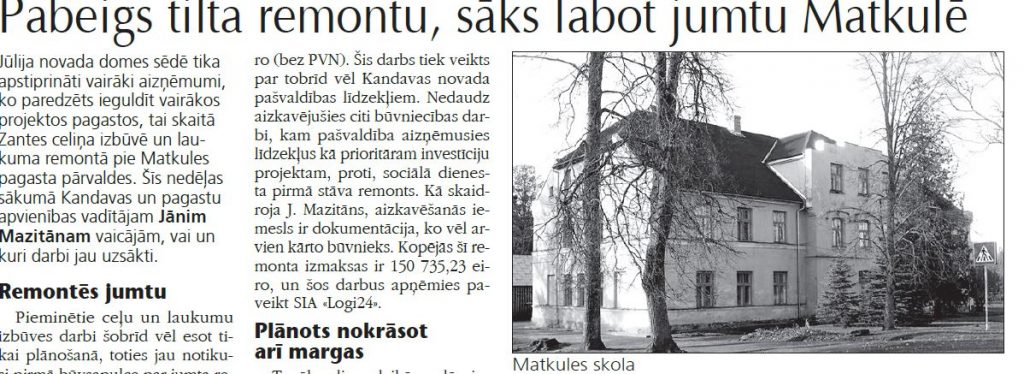 Pieminētie ceļu un laukumu izbūves darbi šobrīd vēl esot tikai plānošanā, toties jau notikusi pirmā būvsapulce par jumta remontu Matkules pagasta »Briedumos». Te iepirkums noslēdzās jūlijā un par uzvarētāju tika atzīts SIA «Erteks». Jumta remonts bijušās Matkules skolas ēkai izmaksās 75 295 eiro (bez PVN). Šis darbs tiek veikts par tobrīd vēl Kandavas novada pašvaldības līdzekļiem. Nedaudz aizkavējušies citi būvniecības darbi, kam pašvaldība aizņēmusies līdzekļus kā prioritāram investīciju projektam, proti, sociālā dienesta pirmā stāva remonts. Kā skaidroja J. Mazitāns, aizkavēšanās iemesls ir dokumentācija, ko vēl arvien kārto būvnieks. Kopējās šī remonta izmaksas ir 150 735,23 eiro un šos darbus apņēmies paveikt SIA «Logi24».