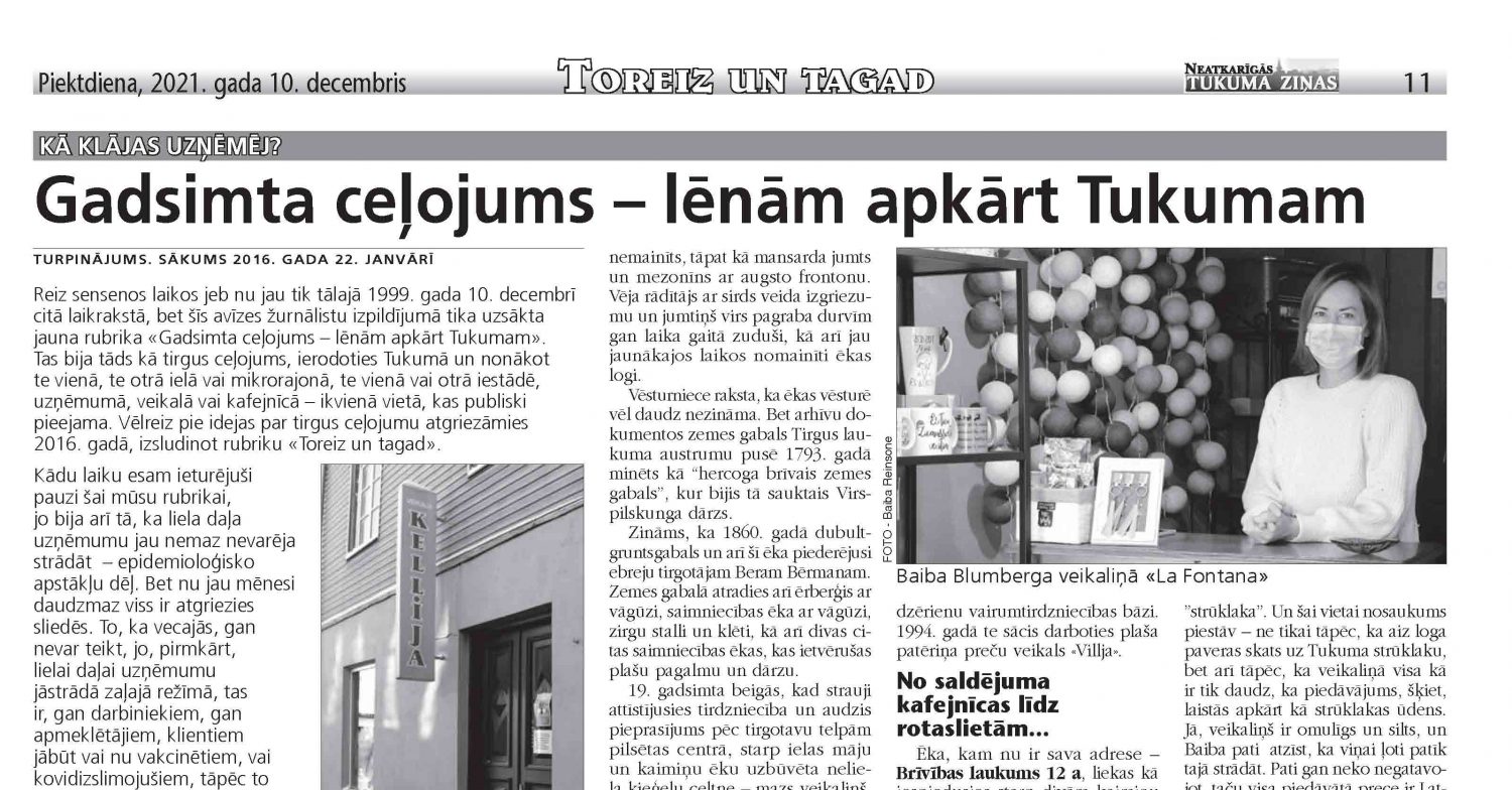 Telpas tiek nomātas, un tajās saimnieko veikaliņa īpašniece Baiba Blumberga. Jāatzīst, paraugoties apkārt, acis ņirb, jo lai gan veikaliņš ir mazs, piedāvājums ir gana plašs – sākot no rotas lietām un beidzot ar apdrukātiem džemperiem un kanvām. Baiba pastāstīja, ka viņa nav šīs tirgošanās aizsācēja – pirms trīs gadiem dzīvē iegrozījies tā, ka pārņēmusi jau esošo «La Fontana» veikaliņu. Kādēļ tāds nosaukums? Tādēļ, ka tas itāļu valodā nozīmējot ”strūklaka”. Un šai vietai nosaukums piestāv – ne tikai tāpēc, ka aiz loga paveras skats un Tukuma strūklaku, bet arī tāpēc, ka veikaliņā visa kā ir tik daudz, ka piedāvājums šķiet laistās apkārt kā strūklakas ūdens. Jā, veikaliņš ir omulīgs un silts, un Baiba pati atzīst, ka viņai ļoti patīk tajā strādāt. Pati gan neko negatavojot, taču visa piedāvātā prece ir Latvijas iedzīvotāju roku darbs. ”Mēs visu laiku mēģinām saviem klientiem piedāvāt kaut ko jaunu. Tā, piemēram, šobrīd mūsu jaunums ir cepures, džemperi un krūzītes ar uzrakstiem, rokām gatavotas lelles. Cenas, kā jau visur, dažādas – sākot ar 1.50 eiro par aploksnītēm un auskariņiem par 4 eiro, līdz rotaslietām, kas maksā jau 30 eiro Jā, šis ir tas aktīvākais laiks, kad cilvēki meklē saviem mīļajiem dāvanas, un tas, ka ir pandēmija, nevienu no tā neattur – Ziemassvētki nav atcelti. Mēs apmeklētāju ziņā nejūtam lielu atšķirību, kā tas bija citu gadu un kā – šogad. Taču kopumā vērtējot, šis gads mums nebija viegls – nācās slēgt veikalu vairākas reizes – gada sākumā uz trīs mēnešiem un nupat – oktobrī. Bet mēs centāmies pie cilvēkiem iet savādāk – ar sociālo tīklu starpniecību. Mums nav interneta veikala, bet savu produkciju piedāvājam, piemēram, facebook un instagram. Strādāju viena, un man izdevās dabūt arī dīkstāves pabalstu. Liels paldies jāsaka arī telpu īpašniecei, kas bija ļoti pretimnākoša un dīkstāves mēnešos mums atlaida īres maksu,” tā Baiba. Jautāta par tendencēm, Baiba pastāstīja, ka katru gadu ir jūtams, ka cilvēki pieprasa kaut ko vienu. Tā bijis brīdis, kad visiem bija vajadzīgas šalles ar latvju rakstiem, nu tās vairs neesot aktuālas. Nu dāvanām pērkot gan kanvas ar dažādiem uzrakstiem, kā arī T-krekli, džemperi un cepures. Mazajiem domāts jaunums esot ar rokām darinātas rotaļlietas – aktuālākās esot lapsiņas, kas veidotas pēc raidījuma «Tutas lietas» lapsas prototipa. Stāsta Baiba: “Arī ar rotas lietām ir ļoti interesanti – ir periods, kad visiem ir nepieciešamas neredzamās kakla rotas, tad Svarovska kristālu auskariņus… Tas tiešā, dīvaini, kā visiem vienlaikus mainās prasības… Un, jā, pieprasīti ir arī koka dekori, uz kuriem ir uzraksti – gan mīļi vārdi par mammu, omi, tēti, gan arī tādi – ar humora devu.”