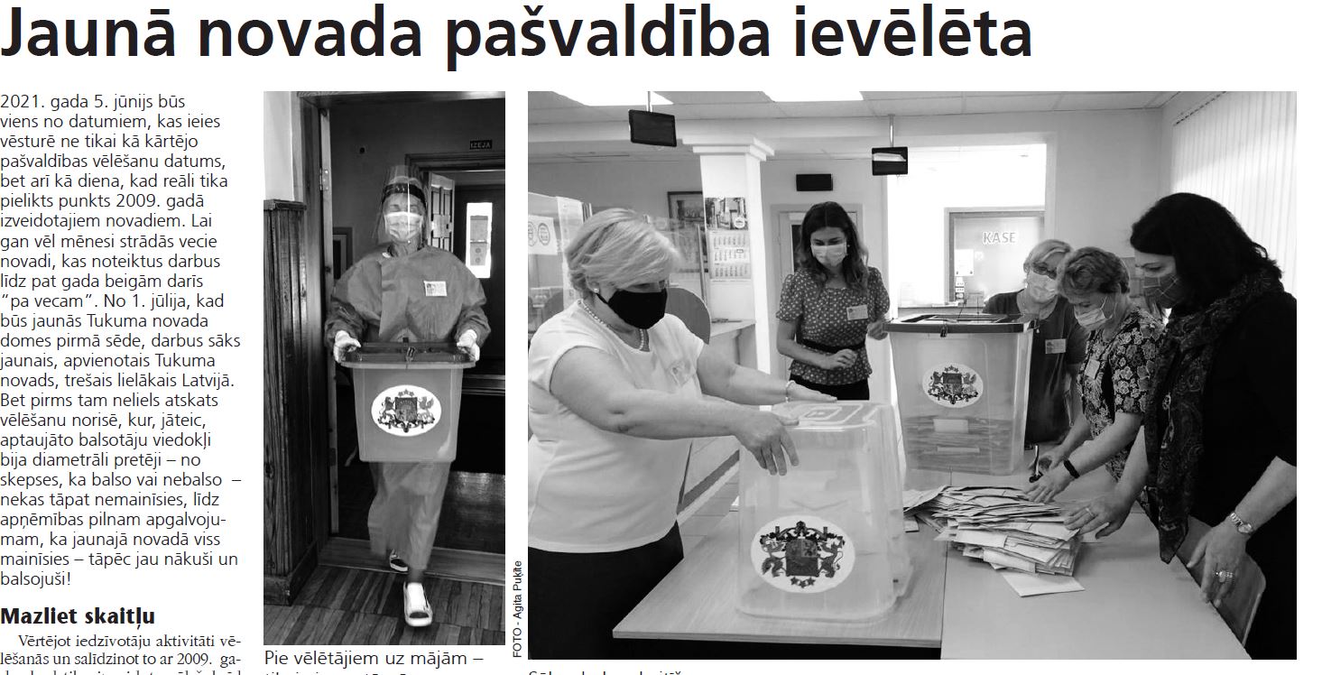 - gada 5. jūnijs būs viens no datumiem, kas ieies vēsturē ne tikai kā kārtējo pašvaldības vēlēšanu datums, bet arī kā diena, kad reāli tika pielikts punkts 2009. gadā izveidotajiem novadiem. Lai gan vēl mēnesi strādās vecie novadi, kas noteiktus darbus līdz pat gada beigām darīs “pa vecam”. No 1. jūlija, kad būs jaunās Tukuma novada domes pirmā sēde, darbus sāks jaunais, apvienotais Tukuma novads, trešais lielākais Latvijā. Bet pirms tam neliels atskats vēlēšanu norisē, kur, jāteic, aptaujāto balsotāju viedokļi bija diametrāli pretēji – no skepses, ka balso vai nebalso – nekas tāpat nemainīsies, līdz apņēmības pilnam apgalvojumam, ka jaunajā novadā viss mainīsies – tāpēc jau nākuši un balsojuši!