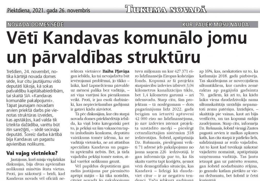 Tā pēc diskusijām, kur citu starpā novada domes priekšsēdētājs iebildās, ka viņš būtu kategoriski pret to, ja pēkšņi uz šīm vakancēm taptu izsludināts konkrurss, deputātu vairākums tomēr izlēma, ka ne vadītāja vietnieka, ne arī attīstības speciālista Kandavas un pagastu apvienībā nebūs. Bet, ja tāda vajadzība pŗkšņi tomēr rastos, atkal varēšot nolikumu grozīt.