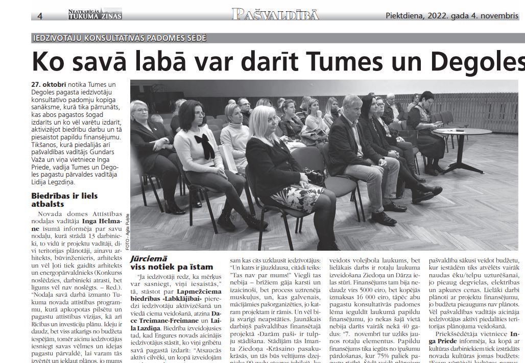 Novada domes Attīstības nodaļas vadītāja Inga Helmane īsumā informēja par savu nodaļu, kurā strādā 13 darbinieki, to vidū ir projektu vadītāji, divi teritorijas plānotāji, ainavu arhitekts, būvinženieris, arhitekts un vēl ļoti tiek gaidīts arhitekts un energopārvaldnieks (Konkurss noslēdzies, darbinieki atrasti, bet līgums vēl nav noslēgts. – Red.). “Nodaļa savā darbā izmanto Tukuma novada attīstības programmu, kurā apkopotas pilsētu un pagastu attīstības vīzijas, kā arī Rīcības un investīciju plānu. Ideju ir daudz, bet viss atkarīgs no budžeta iespējām, tomēr aicinu iedzīvotājus iesniegt savas vēlmes un idejas pagastu pārvaldē, lai varam tās izvērtēt un iekļaut plānos, jo mums ir svarīgi zināt, ko iedzīvotāji vēlas. Citādi – varam visu ko izdomāt, bet, iespējams, jums tas nemaz nav vajadzīgs, bet, ja ir laba ideja, meklēsim tai finansējumu arī ārpus pašvaldības budžeta – Eiropas fondos, pārrobežu programmās, Lauku atbalsta dienesta projektos.” I. Helmane vēl informēja, ka novads ir partneris divās sadarbības partnerībās – Kandavas partnerībā un «Laukiem un jūrai», un tas ļauj piesaistīt papildu līdzekļus dažādiem projektiem: “Tumes un Degoles pagasts ietilpst partnerībā «Laukiem un jūrai», un ar tās piesaistīto finansējumu projektiem ir sakārtoti ceļi, Degolē ierīkots Putnu parks, digitalizēti Praviņu kapi, Tumei nopirkts flīģelis un tiek labiekārtots rotaļlaukums ar domu nākotnē to paplašināt. Tāpēc, kā jau minēju, aicinu iedzīvotājus un biedrības rakstīt projektus, savukārt pašvaldība atbalstītajām idejām piešķir līdzfinansējumu, lai nebūtu jāiegulda sava nauda. Tagad ir īstais laiks šīs biedrības veidot, jo nākamā gada janvārī būs nākamais projektu konkurss. Ja ir vajadzīgs kāds skaidrojums, aiciniet – stāstīsim.”