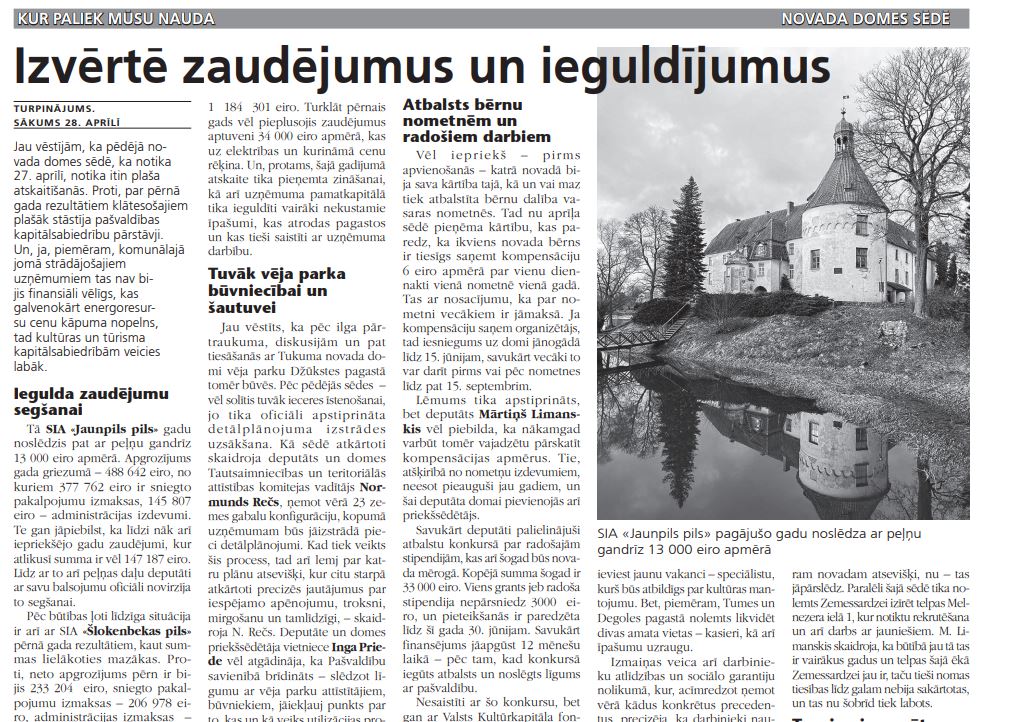 Pārsvarā tādēļ, ka tarifus bijusi iespēja mainīt nedaudz dinamiskāk, nekā tas bija, piemēram, SIA «Tukuma siltums» un citiem uzņēmumiem, peļņa 14 000 eiro apmērā pērn bijusi arī komunālajai saimniecībai «Jaunpils». Un identiski, kā tas gadījumā ar novada pilīm, arī šajā gadījumā konkrētā summa aiziet zaudējumu mazināšanai, kas ir mazliet vairāk nekā 94 000 eiro.