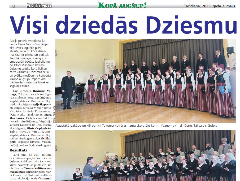 Labā ziņa, ka visi Tukuma dziedāšanas apriņķa kori tiek uz Dziesmu svētkiem, taču katra veikums novērtēts ar punktiem, un divi kori – Tumes kultūras nama jauktais koris (diriģente Marta Ozola) un Tukuma kultūras nama skolotāju koris «Vanema» (Tālivaldis Gulbis) – ar 45 punktiem ieguva Augstākā pakāpi.