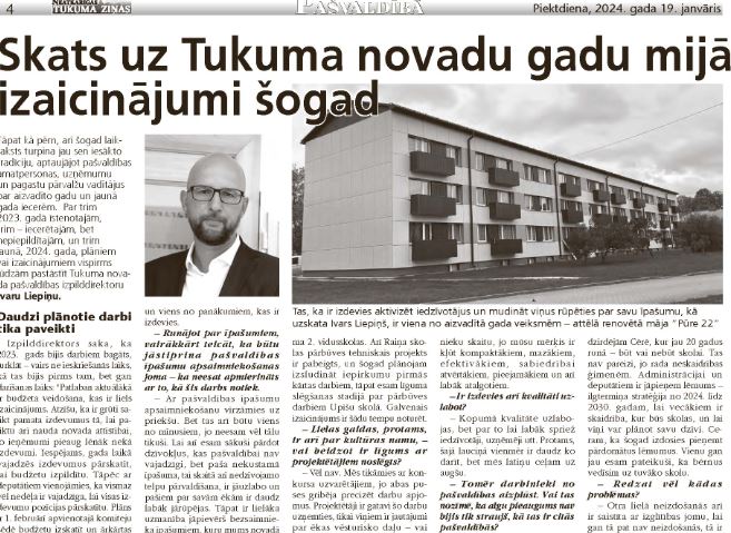 Tāpat kā pērn, arī šogad laikraksts turpina jau sen iesākto tradīciju, aptaujājot pašvaldības amatpersonas, uzņēmumu un pagastu pārvalžu vadītājus par aizvadīto gadu un jaunā gada iecerēm. Par trim 2023. gadā īstenotajām, trim – iecerētajām, bet nepiepildītajām, un trim jaunā, 2024. gada plāniem vai izaicinājumiem, vispirms lūdzām pastāstīt Tukuma novada pašvaldības izpilddirektoru Ivaru Liepiņu.