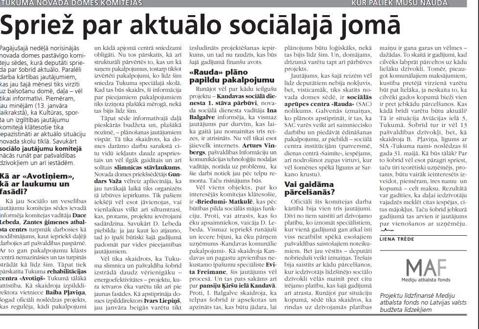 Oficiāli šīs komitejas darba kārtībā bija vien trīs jautājumi. Divi no tiem saistīti arī dzīvojamo platību, ko iznomāt speciālistiem, kur vienā gadījumā gan atkal īsti viss neatbilst spēkā esošajiem pašvaldības saistošajiem noteikumiem. Bet jau vēstīts – deputāti nobrieduši veikt izmaiņas. Trešais bija saistīts ar kādu pārcelšanos, kur iedzīvotājs līdzšinējo sociālo dzīvokli vēlās mainīt pret citu īrējamo platību, kas šajā gadījumā arī atrasta. Runājot par situāciju kopumā, sēdē tika skaidros, ka rindas uz dzīvojamās platības maiņu ir gana garas un vēlmes – dažādas. To skaitā ir gadījumi, kad cilvēks labprāt pārceltos uz kādu lielāku dzīvokli. Tomēr, pieaugot komunālajiem maksājumiem, kustība pretējā virzienā varētu būt pat lielāka, ja neskaita to, ka cilvēki gados kopumā bieži vien ir pret jebkādu pārcelšanos. Kas kādā brīdī varētu būtu aktuāli? Tā ir situācija Aviācijas ielā 3, Tukumā. Šobrīd tur ir vēl 13 (???) pašvaldības dzīvokļi, bet, kā skaidroja B. Pļaviņa, līgums ar SIA «Tukuma nami» noslēdzas šī gada 31. maijā. Kā būs tālāk? Par to šobrīd vēl esot pāragri spriest, taču tīri teorētiski uzņēmējs, protams, būtu vairāk ieinteresēts izveidot, piemēram, īres namu un kopumā – celt maksu. Rezultātā var gadīties, ka daļai iedzīvotāju vajadzēs meklēt citas iespējas, citus mājokļus. Taču šobrīd jebkurā gadījumā tas arvien ir jautājums par vienošanos ar uzņēmēju.