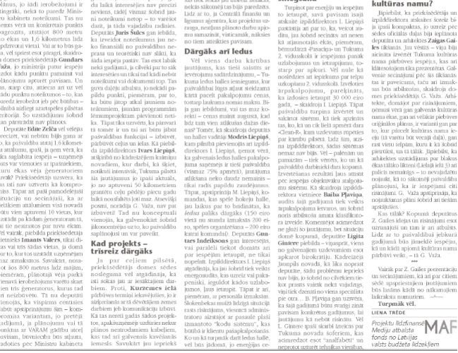 Jāpiebilst, ka priekšsēdētāja un izpilddirektora atskaites šoreiz bija īpaši kompaktas, jo uzreiz pēc sēdes oficiālās daļas bija ieplānota deputātu un arhitektes Zaigas Gailes tikšanās. Jau vēstīts,– viņa bija aicināta izvērtēt Tukuma kultūras nama pārbūves iespējas, kas arī klātesošajiem tika prezentētas. Galvenie secinājumi pēc šīs tikšanās: tas ir paveicams, taču arī izmaksas būs atbilstošas, skaidroja domes priekšsēdētājs G. Važa. Arhitekte, domājot par risinājumiem, ņēmusi vērā gan galvenās kultūras nama ēkas, gan arī vēlākās piebūves oriģinālos plānus, ir varianti gan par to, kur pārcelt kultūras nama ieeju (tā varētu būt vecajā daļā), gan rast vietu telpām, kuru it kā šobrīd pietrūkst un tā tālāk. Jāpiebilst, ka arhitektes uzstādījums par blakus ēkas tālāko likteni (Lielā ielā 3) arī palicis nemainīgs – to nevajadzētu nojaukt, kā to sākotnēji pašvaldība plānojusi, ko ir iespējami citi risinājumi. G. Važa apstiprināja, ka nojaukšanas plāni šobrīd arī tiešām apstājušies.