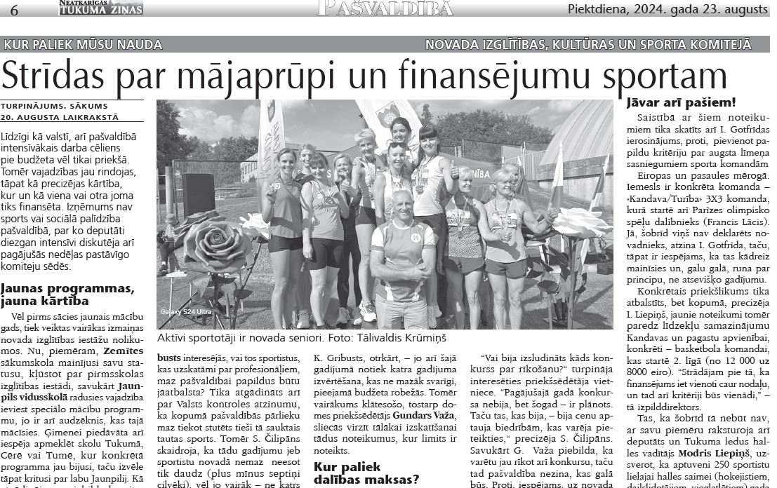 Jāpiebilst, ka tieši jauniešu piesaiste komandai, sporta veidam, būs viens no būtiskiem kritērijiem jaunajos noteikumos, vērtējot pašvaldības atbalstu. Un kā piebilda Kultūra un sporta nodaļas vadītāja Laura Stūrīte, diskutēts ir daudz, un šajā gadījumā tas, kā nauda tiek piešķirta, šķiet, būšot daudz mazāk subjektīvs process, kā līdz šim. Vēl deputāti kārtējo reizi aizrunājās par to, vai nenoteikt tomēr konkrētāk tā sauktos prioritāros sporta veidus novadā, kas tiek atbalstīti? S. Čilipāns gan skaidroja, ka daļēji tas tā tiešām jau arī dabiski ir izveidojies, tādēļ šobrīd tāda plāna, vismaz esošo noteikumu kontekstā, neesot. Līdz ar to noteikumi tika virzīti izskatīšanai tālāk finanšu komitejas un domes sēdē.