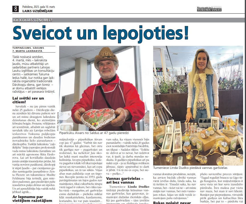 Savulaik – nu jau pirms vairāk nekā 25 gadiem – Dārzkopju diena aizsākās kā dāvana pašiem sev un arī mūsu draugiem laikraksta dzimšanas dienā, ko atzīmējām februāra beigās. Protams, ka vēlējāmies arī iemūžināt, atbalstīt un saglabāt savulaik tālu aiz Latvijas robežām izslavētos Tukuma puķkopju panākumus un daudzu šodienas novadnieku lielo aizraušanos – dārzkopību. Turklāt laikraksta ”zaļo īkšķīšu” līniju joprojām profesionāli vada mūsu laikraksta žurnāliste un arī mācītā agronome Rūta Fjodorova. Lai arī kovidlaiks daudzās jomās atstājis traumējošas pēdas, kā varēja novērot pasākumā, dārzkopji ir stipri ļaudis – pat cienījamus gadus sasniegušās jaunpilniece Zenta Plezere un tukumniece Mudīte Feldmane – bija ierindā, gan sniedzot padomus, gan piedāvājot pašu izaudzētos puķu dēstus un sīpolus. Un arī apmeklētāju bija vairāk nekā jebkad agrāk…