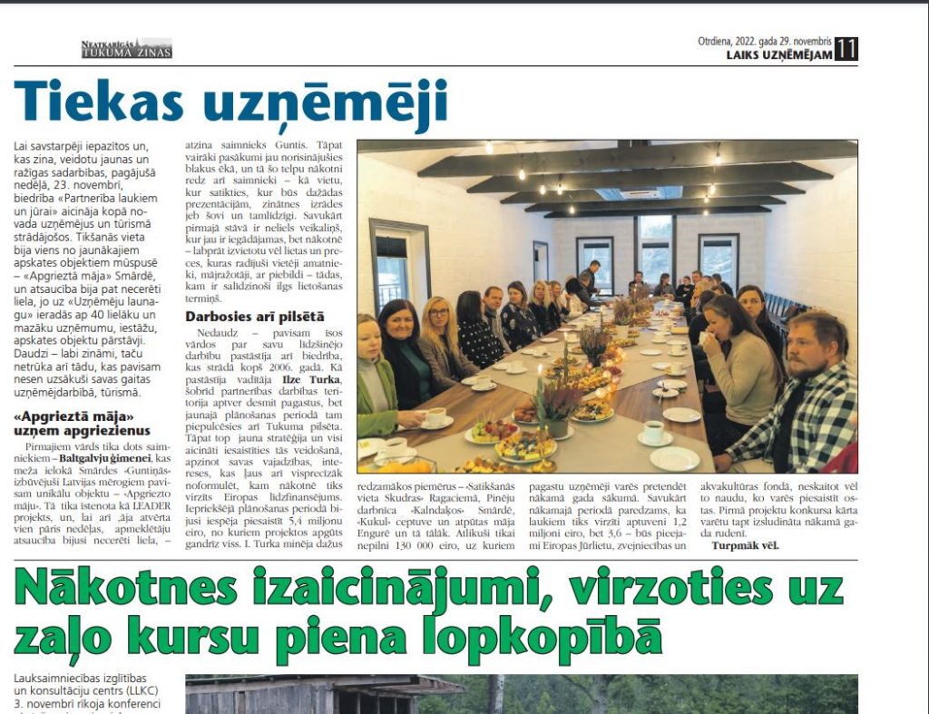 Nedaudz – pavisam īsos vārdos par savu līdzšinējo darbību pastāstīja arī biedrība, kas strādā kopš 2006. gadā. Kā pastāstīja vadītāja Ilze Turka, šobrīd partnerības darbības teritorija aptver desmit pagastus, bet jaunajā plānošanas periodā tam piepulcēsies arī Tukuma pilsēta. Tāpat top jauna stratēģija un visi aicināti iesaistīties tās veidošanā, apzinot savas vajadzības, intereses, kas ļaus arī visprecīzāk noformulēt, kam nākotnē tiks virzīts Eiropas līdzfinansējums. Iepriekšējā plānošanas periodā bijusi iespēja piesaistīt 5,4 miljonu eiro, no kuriem projektos apgūts gandrīz viss. I. Turka minēja dažus redzamākos piemērus – «Satikšanās vieta Skudras» Ragaciemā, Pinēju darbnīca «Kalndaķos» Smārdē, «Kukul» ceptuve un atpūtas māja Engurē un tā tālāk. Atlikuši tikai nepilni 130 000 eiro, uz kuriem pagastu uzņēmēji varēs pretendēt nākamā gada sākumā. Savukārt nākamajā periodā paredzams, ka laukiem tiks virzīti aptuveni 1,2 miljoni eiro, bet 3,6 – būs pieejami Eiropas Jūrlietu, zvejniecības un akvakultūras fondā, neskaitot vēl to naudu, ko varēs piesaistīt ostas. Pirmā projektu konkursa kārta varētu tapt izsludināta nākamā gada rudenī.