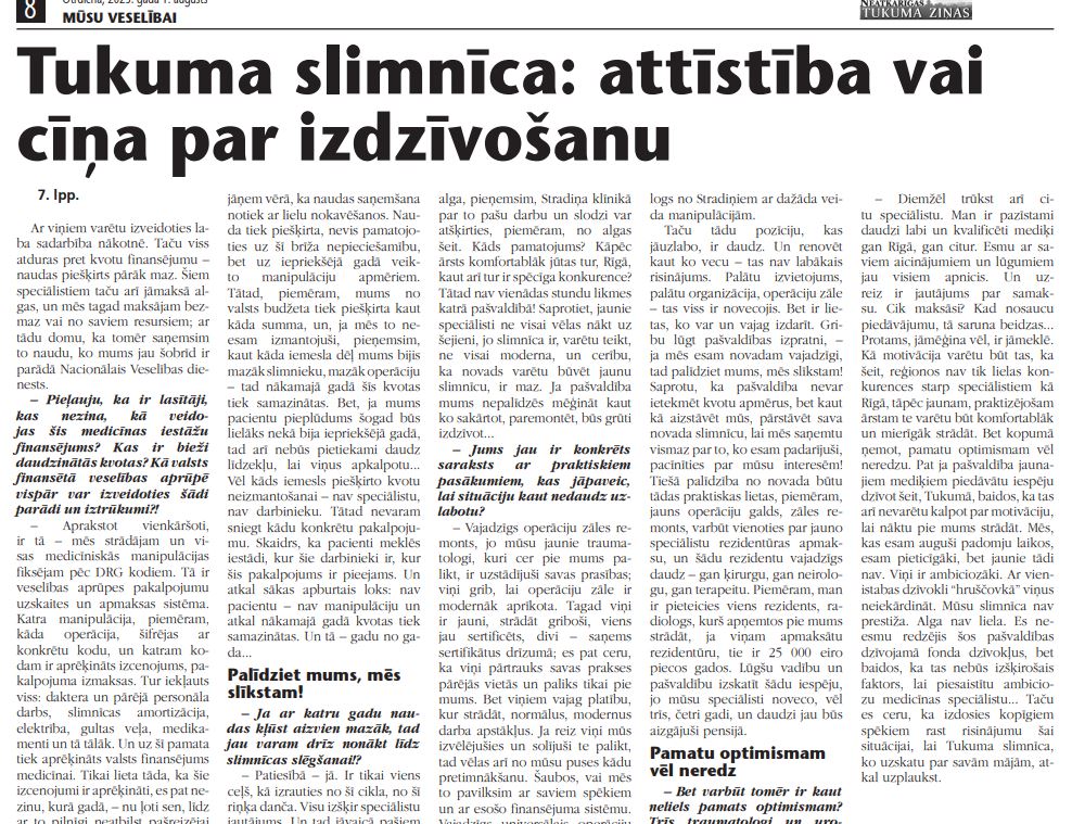 – Ja runājam par panākumiem… Pie mums līdz šim darbojās divi traumatologi – Jānis Liepiņš un Andress Salaks. Liepiņa kungs šobrīd veselības stāvokļa dēļ nevar strādāt, un nezinām, vai viņš atgriezīsies darbā. Paldies Dievam, izdevās atrast traumatologus Rīgas slimnīcās, viņi brauc operēt gan mūsu slimniekus, gan piesaista savējos pacientus plānveida operācijām. Ar viņiem varētu izveidoties laba sadarbība nākotnē. Taču viss atduras pret kvotu finansējumu – naudas piešķirts pārāk maz. Šiem speciālistiem taču arī jāmaksā algas, un mēs tagad maksājam bezmaz vai no saviem resursiem; ar tādu domu, ka tomēr saņemsim to naudu, ko mums jau šobrīd ir parādā Nacionālais Veselības dienests.