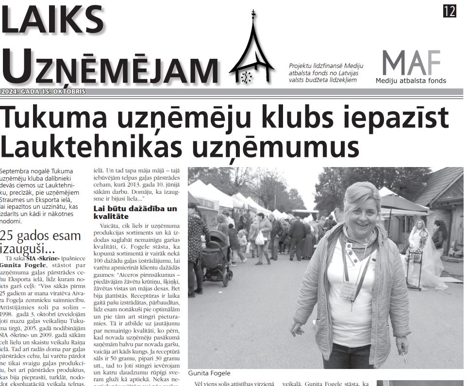 Tā saka SIA «Skrīne» īpašniece Gunita Fogele, stāstot par uzņēmuma gaļas pārstrādes cehu Eksporta ielā, līdz kuram noiets garš ceļš: “Viss sākās pirms 25 gadiem ar mana vīratēva Aivara Fogeļa zemnieku saimniecību. Attīstījāmies soli pa solim – 1998. gadā 3. oktobrī izveidojām ļoti mazu gaļas veikaliņu Tukuma tirgū, 2005. gadā nodibinājām SIA «Skrīne» un 2009. gadā sākām celt lielu un skaistu veikalu Raiņa ielā. Tad arī radās doma par gaļas pārstrādes cehu, lai varētu pārdot ne tikai svaigu gaļas produkciju, bet arī pārstrādes produktus, kas bija pieprasīti, turklāt, nododot ekspluatācijā veikala telpas, bija arī plaša vieta. Tomēr atrast piemērotas telpas šādam ceham nebija nemaz tik vienkārši. Iespēja radās vien 2011. gadā, kad izsolē nopirkām angārveida ēku Eksporta ielā. Un tad tapa māja mājā – tajā iebūvējām telpas gaļas pārstrādes ceham, kurā 2013. gada 10. jūnijā sākām darbu. Domāju, ka izaugsme ir bijusi liela…”
