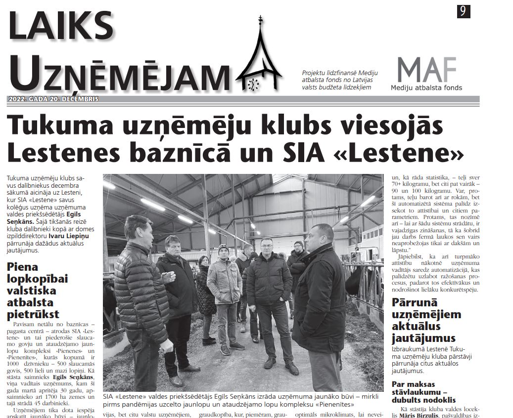- Birzulis stāstīja, ka 2023. gada martā Tukuma uzņēmēju klubam apritēs 20 gadu, tāpēc ir iecerēts šo apaļo jubileju atzīmēt kā īpašāk. Taču tā kā 24. martā, cik zināms, Tukuma novada pašvaldība plāno gadskārtējo uzņēmēju pasākumu, līdz ar to uzņēmēju uz savu jubilejas sarīkojumu orientējas aprīļa vidū: “Plānojam uz to aicināt vecbiedrus, dibinātājus Ilgvaru Kalniņu, Inesi Tīsi un Maksi Rozenbergu, kas bija pirmajā valdē. Esam runājuši, ka šobrīd saucamies Tukuma uzņēmēju klubs, taču, tā kā dalībnieku vidū ir arī novada uzņēmēji un arī pārrunāto jautājumu loks ir plašāks, nevis tikai ar pilsētu saistīti jautājumi, tāpēc, iespējams, būtu jāmaina arī kluba nosaukums. Par to visdrīzāk runāsim kopsapulcē, kas varētu notikt nākamā gada februārī.”