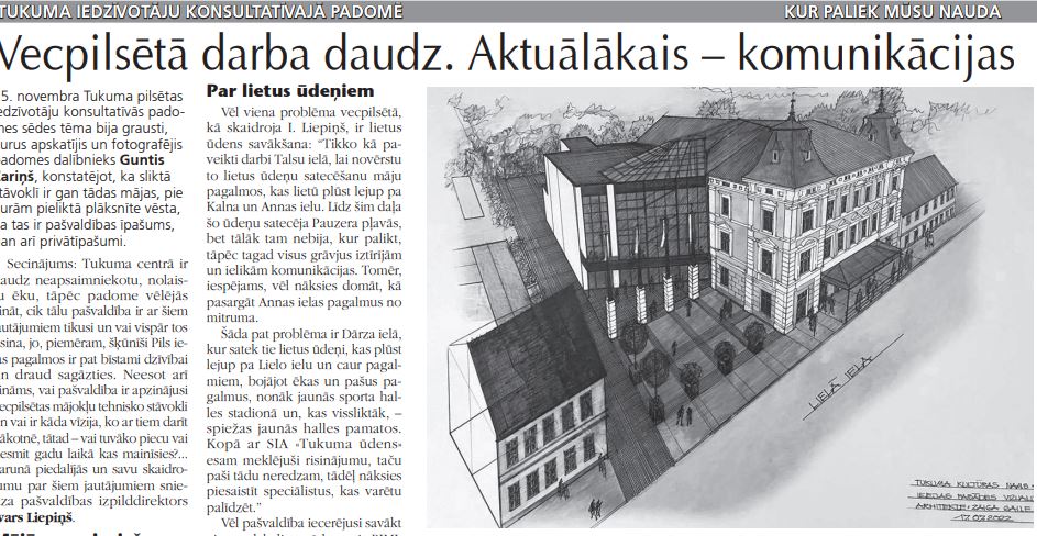 Šāda pat problēma ir Dārza ielā, kur satek tie lietus ūdeņi, kas plūst lejup pa Lielo ielu un caur pagalmiem, bojājot ēkas un pašus pagalmus, nonāk jaunās sporta halles stadionā un, kas vissliktāk, – spiežas jaunās halles pamatos. Kopā ar SIA «Tukuma ūdens» esam meklējuši risinājumu, taču paši tādu neredzam, tādēļ nāksies piesaistīt speciālistus, kas varētu palīdzēt.”