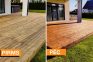- Notīri un nomazgā terasi. Novāc no terases visu lieko un izslauki gružus. Pēc tam nomazgā dēļus ar ūdeni un birsti, rūpīgi noberžot sūnas, netīrumus un vecā pārklājuma paliekas. Spītīgiem traipiem vai pelējumam var lietot speciālus koksnes tīrīšanas līdzekļus. Vari izmantot arī augstspiediena mazgātāju, bet uzmanīgi, lai neizskalotu mīksto koksni. Pēc mazgāšanas ļauj terasei pilnībā nožūt.