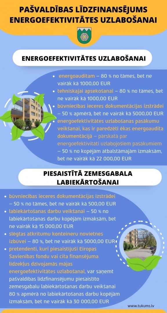 Tukuma novada pašvaldība piedāvā ievērojamu atbalstu daudzdzīvokļu dzīvojamo māju iedzīvotājiem, piešķirot līdzfinansējumu energoefektivitātes uzlabošanai un piesaistīto zemesgabalu labiekārtošanai. Jārēķinās gan ar to, ka pieteikšanās katram atbalsta projektam un dokumentācijas sagatavošana var būt laikietilpīgs un sarežģīts process.