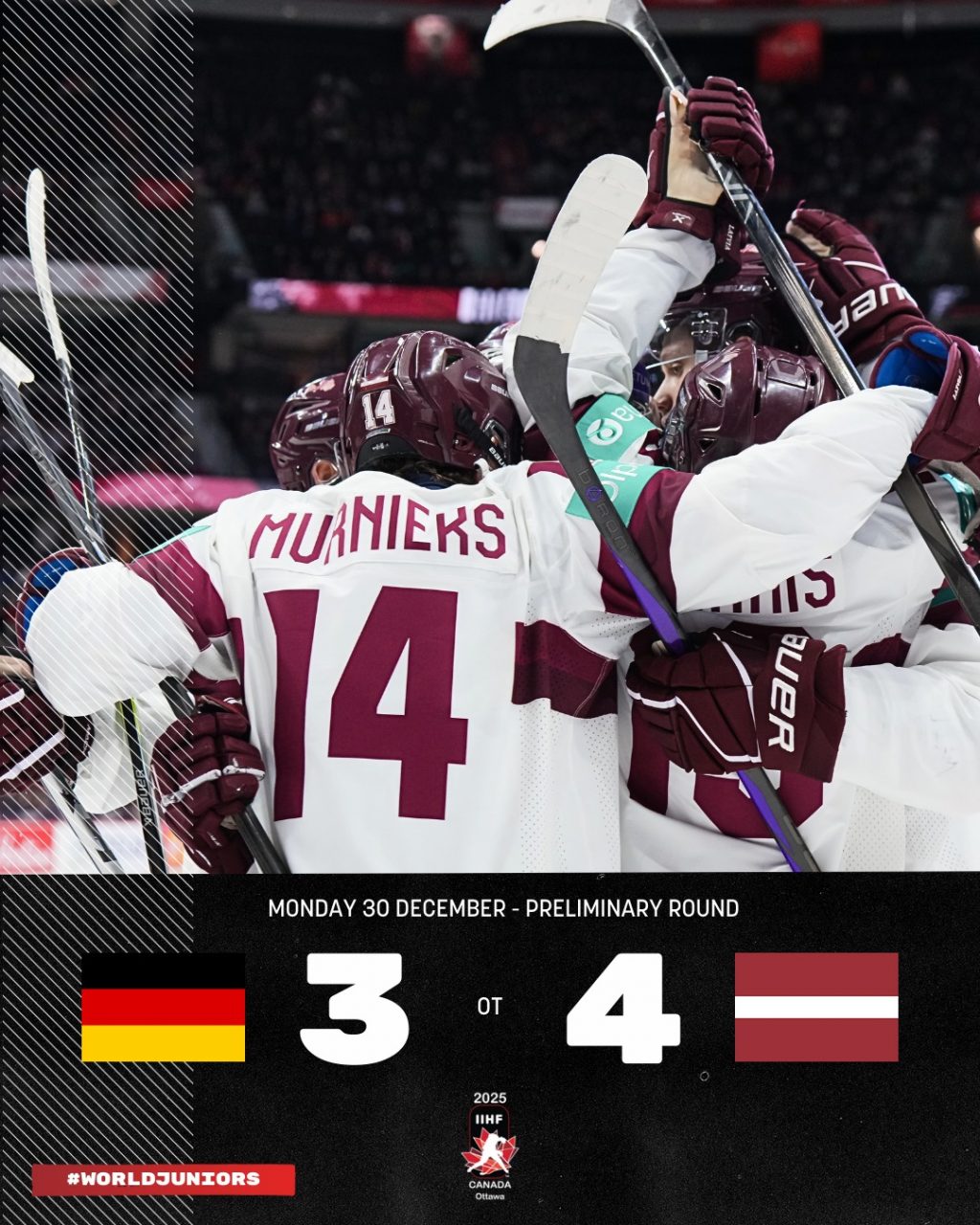 Īsi pēc pusnakts, gada pēdējā dienā, Latvijas U-20 hokeja izlase noslēdza spraigu un emocijām bagātu spēli pret Vācijas izlasi pasaules čempionātā junioriem. Junioru izlasē spēlē arī tukumnieks Markuss Sieradzkis, kurš gan šajā spēlē pie rezultativitātes punktiem netika, bet demonstrēja stabilu sniegumu laukumā. Spēles rezultātu atklāja Vācija jau pirmajā periodā. Otrie vārti arī bija Vācijas izlasei, bet nepilnu minūti vēlāk Ēriks Mateiko spēja vienus vārtus atgūt. Trešā perioda sākumā Bruno Osmanis ar precīzu metienu izlīdzināja spēles rezultātu. Vācija, ņemot vērā to, ka viņiem šī uzvara bija nepieciešama, lai turpinātu cīnīties par iespējām iekļūt ceturtdaļfinālā, nomainīja vārtsargu pret laukuma sesto spēlētāju, bet Olivers Mūrnieks ātri spēja atbruņot Vācijas uzbrucējus un raidīja ripu tukšos vārtos, izcīnot pirmo pārsvaru spēlē. Īsi pēc tam Vācija šo pārsvaru izlīdzināja, un spēle turpinājās ar rezultātu 3:3 līdz pat pamatlaika beigām. Šajā brīdī jau bija zināms, ka Latvijas izlase ir iekļuvusi ceturtdaļfinālā, izcīnot vienu punktu, bet tāpat turpinājās cīņa par vietu grupā. Tādēļ Latvija turpināja spēlēt savu spēli, izcīnot uzvaru, kad Ēriks Mateiko papildlaikā guva savus otros vārtus spēlē, noslēdzot šo spēli ar 4:3.