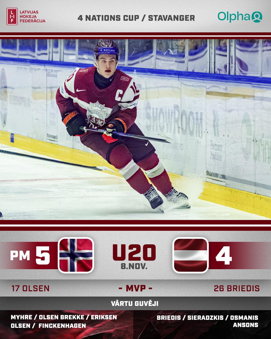 Latvijas izlase šajā spēlē divreiz prata atspēlēties, demonstrējot cīņassparu līdz pat pēdējām sekundēm. Spēles rezultātu astotajā minūtē atklāja Oskars Nils Briedis, bet drīz vien norvēģi izlīdzināja. Otrās trešdaļas piektajā minūtē, spēlējot vairākumā, Kristers Ansons meta pa vārtiem, ripa atsitās pret apmali aiz vārtiem un atleca uz otru pusi, kur Markuss Sieradzkis to raidīja mērķī – 2:1 Latvijai