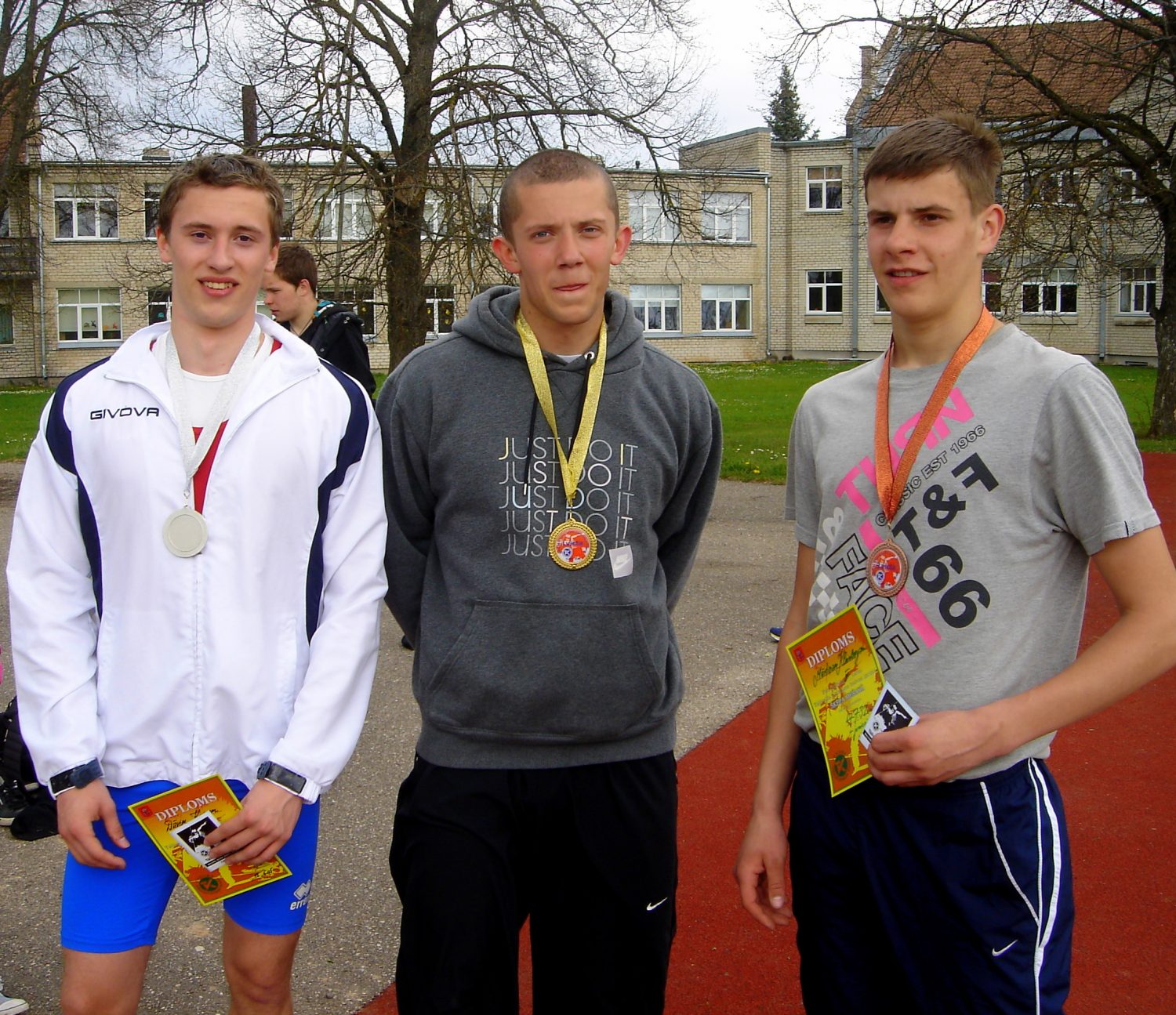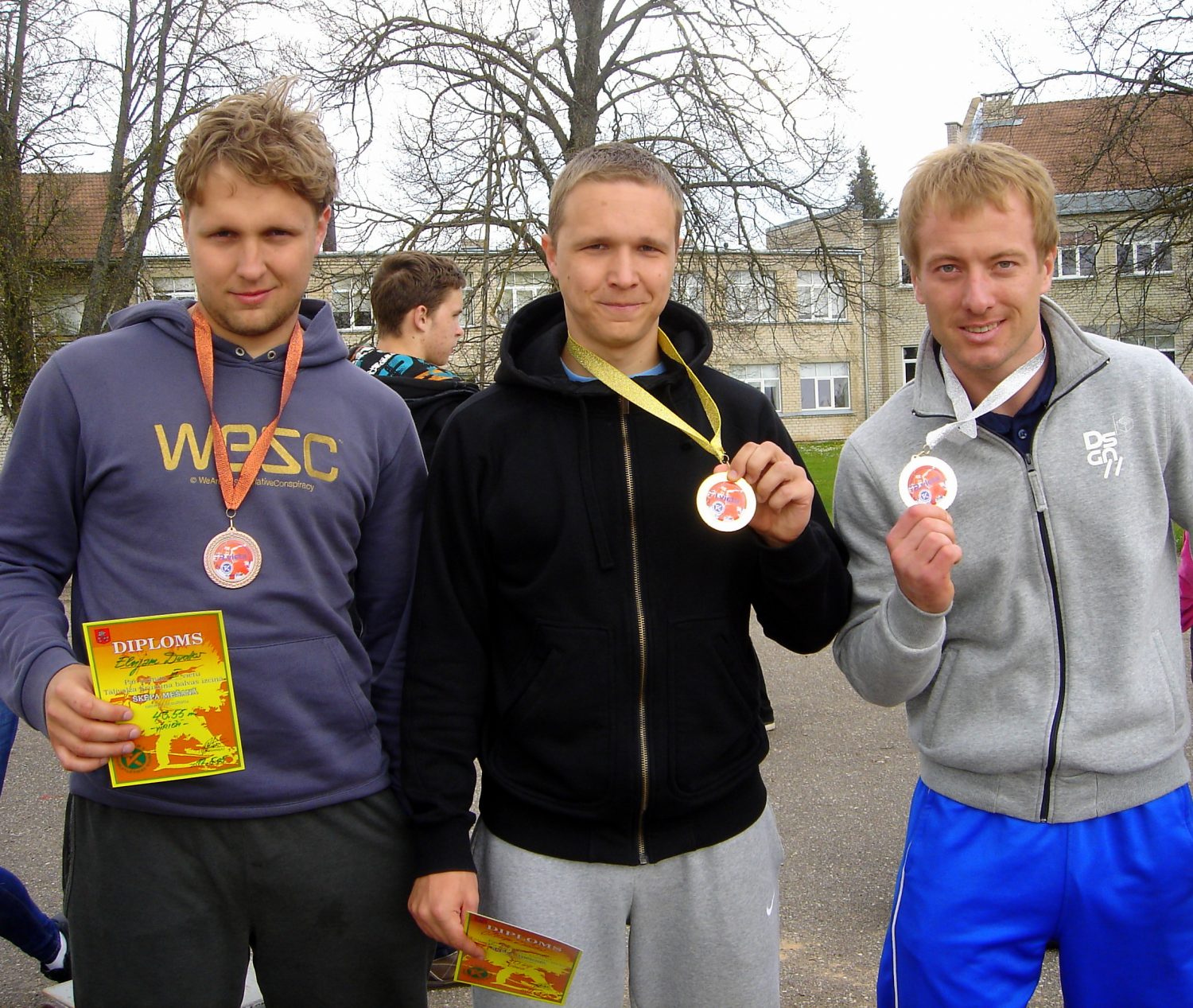 «C» grupā zēniem godalgoto trijniekā visi kandavnieki: Raivis Garoza – 33,24 m, Valts Baumanis – 31,40 m un Edijs Kaņeps – 27,28 m, savukārt meitenēm uzvarēja Dane Grauzermane – 20,85 m; 2. vietā Elza Krastiņa (Rīga «Arkādija») – 17,85 m; «B» grupā zēniem čempiona titulu ar lielisku rezultātu izcīnīja Ričards Griezītis – 53,33 m (Sigulda), 2. un 3. vietu attiecīgi izcīnīja Rūdolfs Streičs (Rīga «Arkādija») – 39,20 m un Ivo Dans Kleinbergs (Kandava) – 31,75 m. Meiteņu grupā uzvaras laurus plūca talantīgā šķēpmetēja Sandija Balande-Balode – 37,64 m, 2. – Beāte Putilovska (abas kandavnieces) – 29,53 m; «A» grupā jauniešiem čempiona godā Ulvis Kleinbergs (Cēre) – 43,97 m, 2. un 3. vietu izcīnīja Krišs Jānis Mežiels – 39.19 m un R. Streičs (abi Rīga «Arkādija») – 39,14 m; Junioru grupā ar sacensību dienas labāko rezultātu – 54,89 m – čempiona titulu izcīnīja kandavnieks Toms Rozenbergs, kurš šobrīd trenējās Rīgā treneres Valentīnas Eidukas vadībā. 2. un 3. vietu izcīnīja treneres Ināras Aparānes (Rīga «Arkādija») audzēkņi Dāvis Kuks – 48,09 m un Mārtiņš Kleinbergs – 47,32 m.