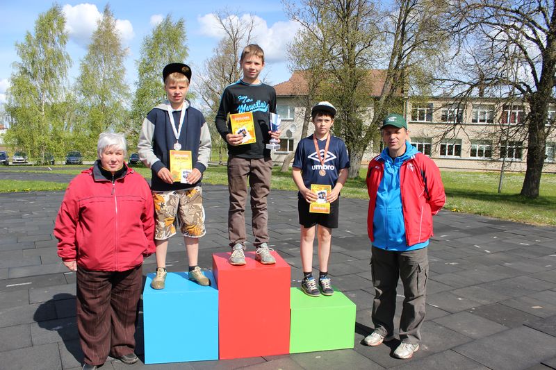 6693 – Apbalvoti pirmie sacensību uzvarētāji C grupā – kandavnieki no kreisās puses trenere Elvīra Juhņeviča, Arvils Zeltiņš, Raivis Seļivanovs, Miks Muska