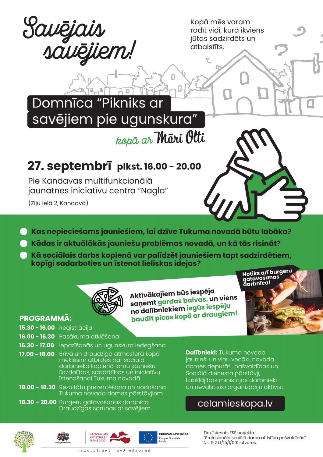 Kādam jābūt sociālajam darbam kopienā, lai tas būtu jauniešiem saprotams, pieejams un iesaistošs, un ko par to domā paši jaunieši? Lai diskutētu par sociālā darbinieka kopienā lomu jauniešu līdzdalības, sadarbības un iniciatīvu īstenošanai Tukuma novadā, trešdien, 27.septembrī, Kandavā tiek rīkota domnīca “Pikniks ar savējiem pie ugunskura”.