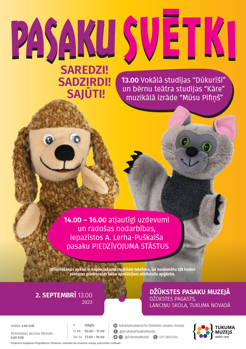 No plkst. 14.00 līdz plkst. 16.00 apmeklētājus sagaidīs atjautīgi uzdevumi un radošas nodarbības, kur caur A.Lerha-Puškaiša apkopotajām pasakām orientēšanās spēlē iespēja iepazīt pasaku PIEDZĪVOJUMA STĀSTUS. Uzzināt, kā circenis pievīla peli, kāpēc čūska un gliemezis nevar iet pāri ceļam, kā vāvere vārdu ieguvusi, kādēļ skudrai pāržmaugts vidus, bet varde lēkšus lec. Spēlei nepieciešama mobilā telefona QR koda aplikācija. Karti varēs saņemt muzeja kasē.
