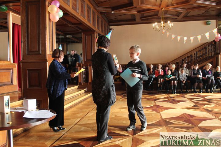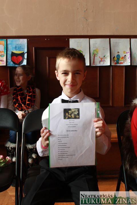 Kultūras nama Mazajā zālē pavisam cita noskaņa – sargies durvis vērt, kad mazākie skolas bērni dzejoļus lasa – tas ir svēts mirklis; dažam ar mammu pie rokas, tomēr arī biklākajiem tika gan svētku fanfaras, gan atzinība. Konkursā, kā jau konkursā, arī savi uzvarētāji. Šogad 3. vieta Zantes pamatskolas skolēnam Ernestam Jānim Kodolam; 2. – Kandavas internātvidusskolas skolniecei Beātei Betai Makovskai, bet 1. – Kandavas K. Mīlenbaha vidusskolas skolēnam Valteram Garancim. Uzvarētājam pavaicājām, vai daudz dzejoļu sarakstījis, un 3. klases puisis atzinās, ka patiesībā maz – viņš vairāk daiļlasītājs esot, tomēr arī 1. un 2. klasē šajā konkursā godalgotas vietas ieguvis. Ko lai novēl tādam talantam – lai veicas arī turpmāk!