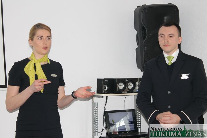 Darba ikdiena – debesīs – tāds ir Lienes Mudrovas un Krista Kulmaņa pienākums, jo viņi apguvuši stjuarta amata prasmes un strādā nacionālajā aviolīnijā «AirBaltic». Ieskatīties šīs profesijas aizkulisēs bija ļauts tiem, kuri pagājušā nedēļā pabija jauniešu centra «Nagla» rīkotajā Karjeras dienā.