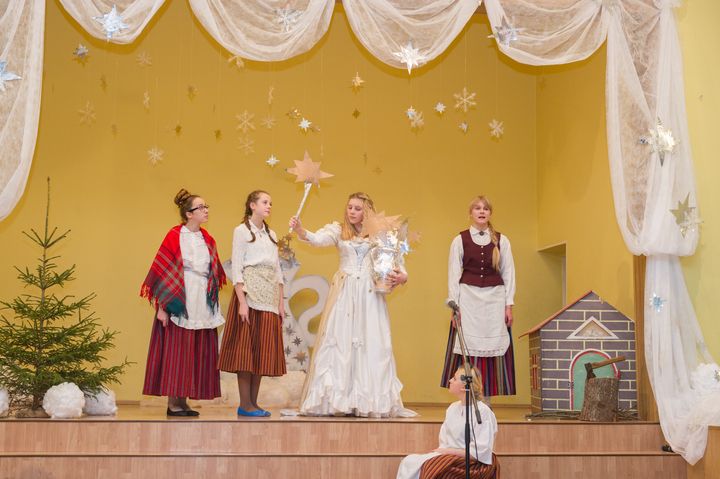 Vakarā 6. – 12. klašu skolēni pulcējās zālē, lai noskatītos režisores Sandras Aukšmukstes un viņas palīgu – Intas Pakalns Palejas un Innas Jēkabsones – veidoto uzvedumu «Zvaigžņu krūze». Laima bija darinājusi sev tērpu – vizoši baltu kā agrīnais sniegs. Dažas dienas pirms Jaunā gada viņa to izrotāja, paņēma varenu sudraba krūzi un sabēra tajā daudzas spulgas zvaigznes. Lielā dāvinātāja gāja aplaimot ļaudis. Krūzē atradās Mīlestības zvaigzne, Atmiņu zvaigzne, Cerības zvaigzne. Redzēdami krāšņo, sudrabtērpto sievieti, daudzi smīkņādami novērsās. Tā Laima staigāja pa ļaužu mājokļiem, līdz kādā no tiem Laima redzēja, ka no viņas krūzes visas zvaigznes tiecas pretī blakus istabā skanošajai dziesmai. Viņa paņēma zaļi sudrabaino Cerības zvaigzni un piesprauda pie mājas vējtverīša aukstās sienas, bet pati brida tālāk pa šaurajām ieliņām, izņēma no krūzes vismazāko zvaigzni – blāvi zilo Pieticības zvaigzni un sildīja pie tās rokas. Šī zvaigzne prata klusēt. Tā nekad nevienam nestāstīs, ka arī lielajiem dāvinātājiem dažreiz pašiem salst rokas. Mūsu skolas skatuves runas pulciņa dalībnieki kopā ar dziedātājiem, mūziķiem un dejotājiem uzbūra šo leģendu, lai arī mēs, pārējie, pamanītu Laimesmātes pēdas un Ziemassvētku laikā ielaistu sirdī zeltainu staru no viņas zvaigžņu krūzes. Tieši šobrīd esam balta ceļa sākumā, kad varam tiekties pēc jaunas Cerību zvaigznes.