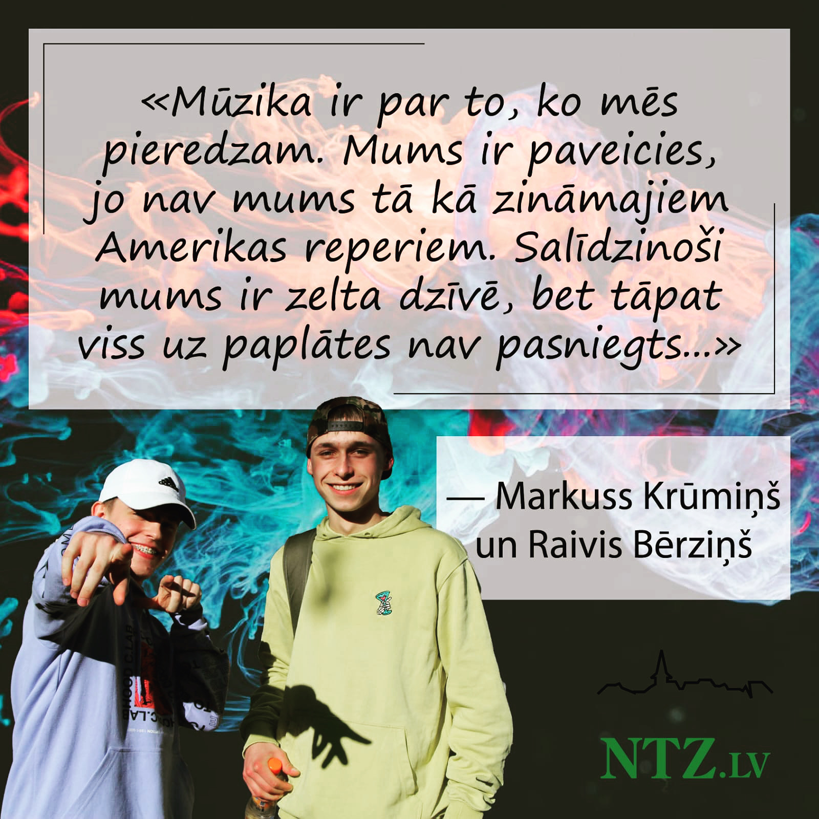 Markuss Krūmiņš un Raivis Bērziņš mācās Tukuma Raiņa ģimnāzijā. Turklāt 12. klasē ar matemātikas novirzienu. Taču mūsu redzes lokā viņi nonāca ne jau tāpēc, ka būtu aizrāvušies ar atjautīgiem matemātisku formulu risinājumiem. Puiši ārkārtas stāvokļa laiku izmantojuši radoši un nule kā publiskam vērtējumam nodevuši savu pirmo kopdziesmu.