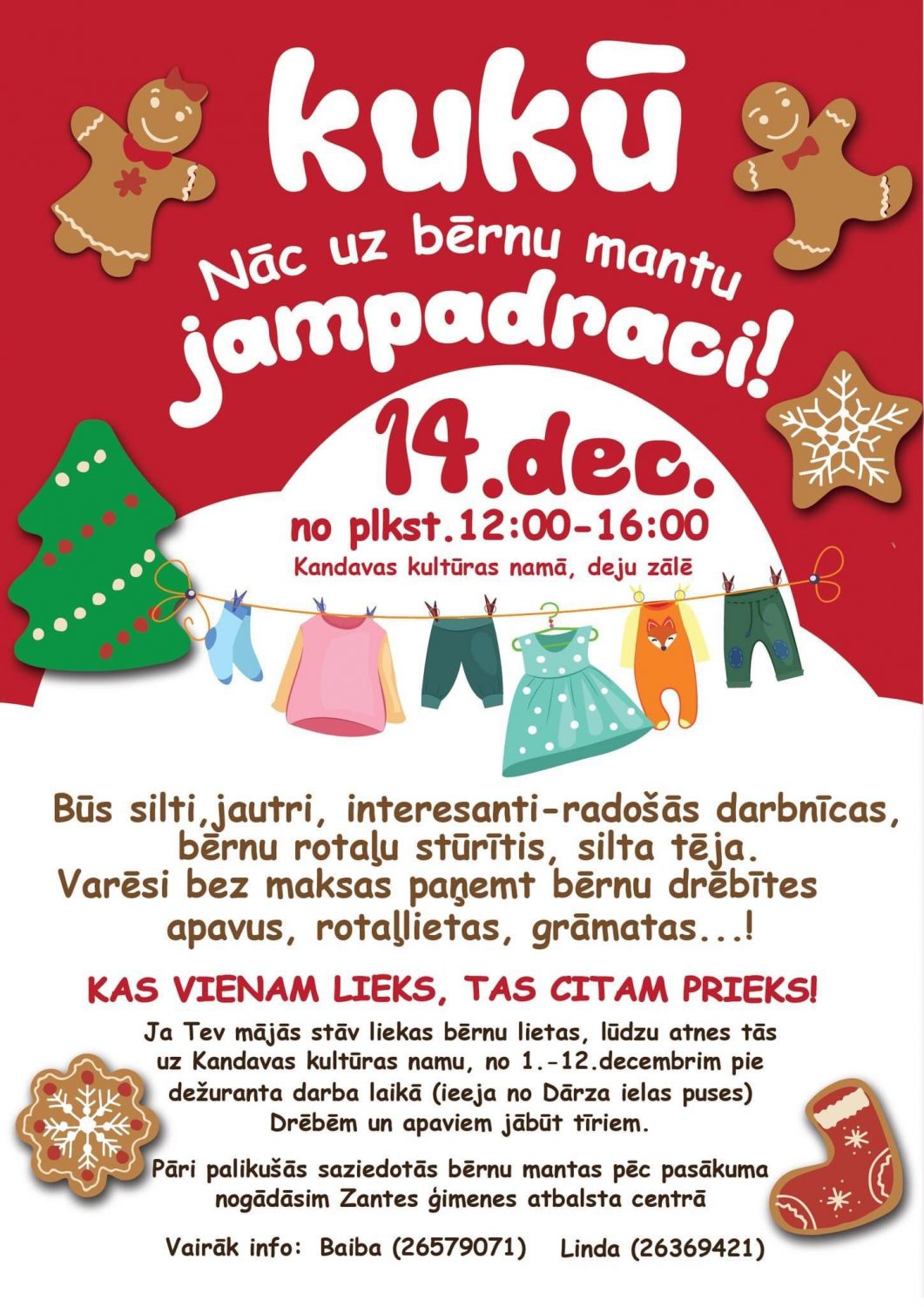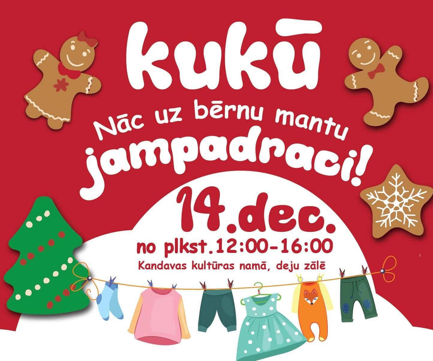 Jau šajā nedēļas nogalē, 14. decembrī Kandavā būs iespēja piedalīties pasākumā «Kukū», kura laikā varēs nest un paņemt bezmaksas bērnu lietas – drēbes, apavus, grāmatas, spēles. Pasākuma laikā būs rūķi, foto stūrītis, bērnu spēļu stūrītis, piparkūkas, karstie dzērieni, dažādas radošās darbnīcas – dāvanu iesaiņojuma papīrs, apsveikuma kartiņas, eglīšu rotājumi….