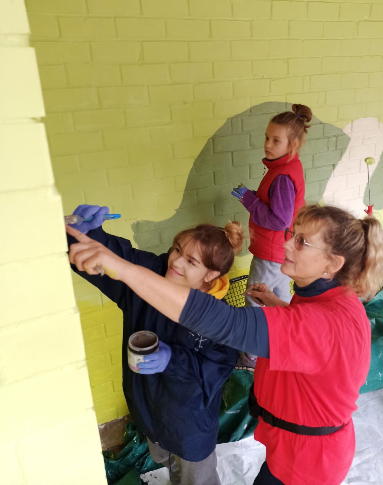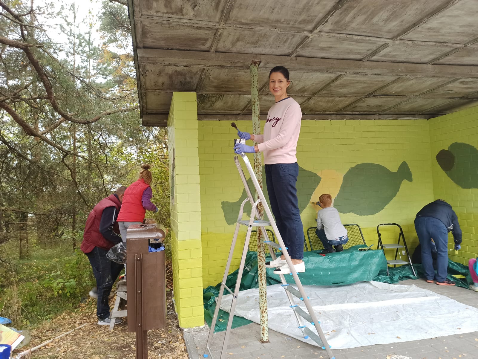 Iesākumā, kad izsludinājuši apgleznošanas talku, pat mazliet sabijušies, atzīst I. Ziemele. Domājuši, ka tā arī nāksies vieniem pašiem strādāt, jo sociālajos tīklos neviens potenciālais dalībnieks iepriekš nav atsaucies. Bijuši gan gatavi arī tādam iznākumam…Taču talkas dienā, 3. oktobrī, saradās jau visai prāvs strādāt gribētāju pulciņš – ap cilvēkiem divdesmit. Rezultātā darbs uz priekšu ritējis pavisam raiti.