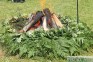 Savukārt «Rūšu» ugunskura vieta par godu šim notikumam bija izpušķota ar ozollapu vītni un ziediem, blakus ugunskuram noliktas ziedošanai paredzētās lietas. Kad bija nodziedātājas dziesmas par godu šai sētai, tika aizdegta un apdziedātāja Jāņu uguns, tai tika atdoti pērnie jāņzālu vainagi. Un pēc tam bija pienākusi kārta ziedošanai. Ar vārdiem «Lai top!» paši pirmie ugunij tika doti graudi – pārtikšanai, tad ozola zariņš – spēkam un pīlādža zariņš – veselībai. «Milzkalnieki» rosināja ugunskuram ziedot arī rozi – krāšņumam un sirdij. Un tad visi kopā nodziedāja turpat netālajās «Brūveļu» mājās pierakstīto Jāņu dziesmu «Sagājāsi Jāņa bērni, sadevāsi rociņāsi».