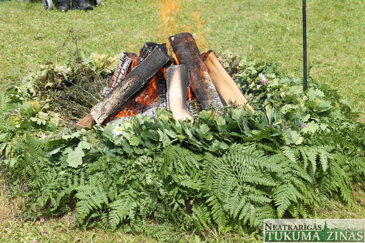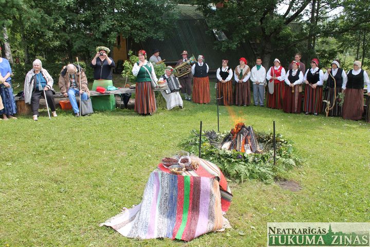 Rituāla laikā tā dalībnieki vēl izdziedāja daudz Līgo dziesmu, izgāja rotaļās un pateicās dabai par to, ka viss izdevies. Un tad bija klāt brīdis cienāties ar to, ko Dievs devis un paši sarūpējuši. Jāpiebilst, ugunskura izdegušās oglītes, kad atdzisušas, jāietin dadža lapā, jānes mājās un jāglabā līdz nākamajam gadam – tās noder mošķu atbaidīšanai un vēdera sāpēm.