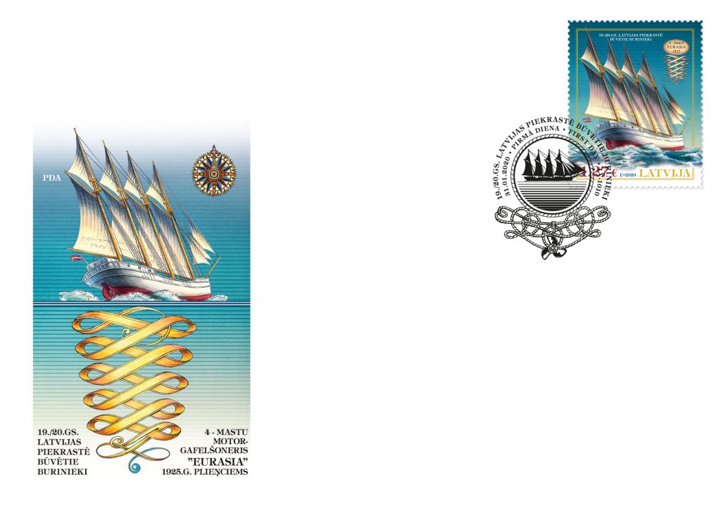 Uz jaunās vēsturisko kuģu sērijas pastmarkas attēlots 1925.gadā Engures novada Plieņciemā darinātais četru mastu buru motorkuģis Eurasia, kuru būvējis slavens latviešu kuģu būvētājs Mārtiņš Morgenšterns. Eurasia bija pēdējais Latvijā uzbūvētais lielākais koka kuģis, kura garums bija 45,5 metri, bet kravnesība – 513 tonnu. 1933.gadā, ar kravu dodoties pāri Atlantijas okeānam, kuģis cietis avārijā un nogrimis.