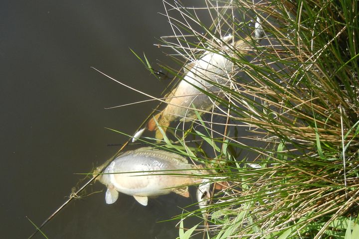 Aina Gravas dīķī bija pavisam drūma – virs tā ”spietoja” kaiju bari, bet sabēdājušies vīri vilka no dīķa ārā, krāva malā, svēra un uzskaitīja kārtējo uzpeldējušo zivju līķu kravu. Līdz 15.00 dīķim un dabai nodarītie zaudējumi bija sasnieguši vairāk nekā 700 kg svara. Kā stāstīja vīri, kaudzes lielāko daļu veido vidēji 6 kg smagas karpas (kopā 100, svarā no 4 līdz 11 kg), bet bija arī pamatīgas līdakas, raudas, līņi, asari, arī divi pērn dīķī ielaistie amūri un pat karūsas, kas tiek uzskatītas par piesārņojuma ziņā ļoti izturīgām zivīm…