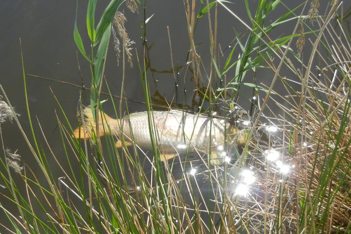 Jaunpils pusē dīķī nobeigušās zivis