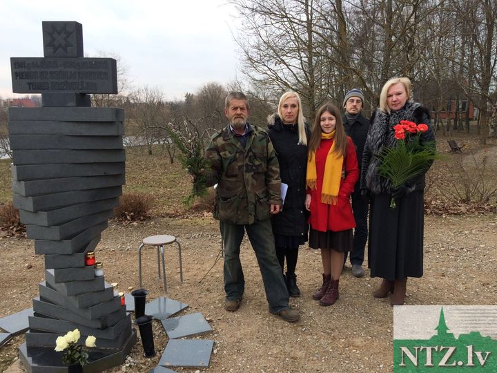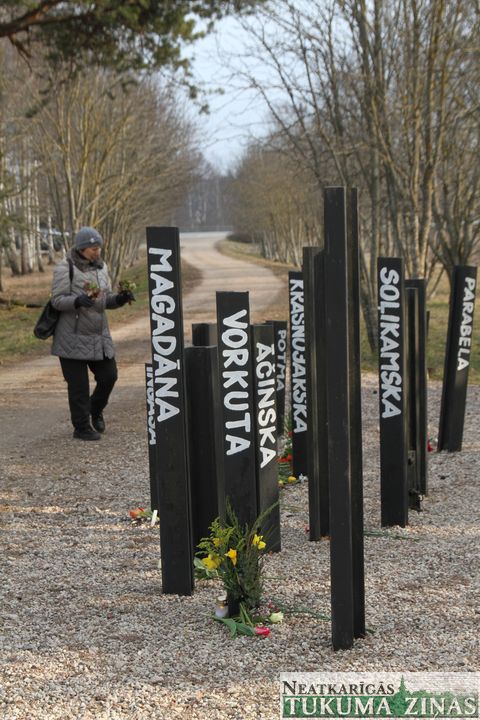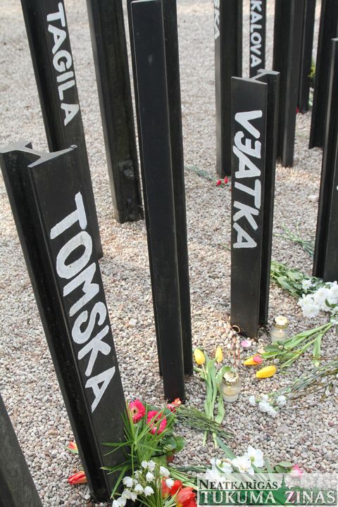 Sagūla ziedi pie piemiņas plāksnēm, kurās ierakstīti visu izsūtīto vārdi un melnajām sliedēm, kas jau daudzus gadus šai vietā atgādina par padomju varas genocīdu pret mūsu tautu.