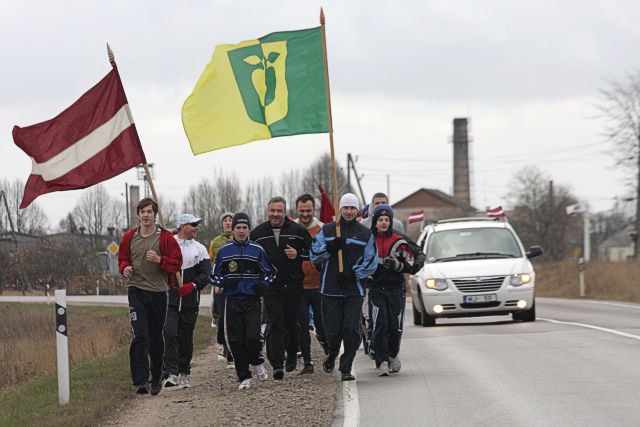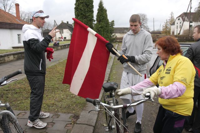 Skrējienu rosināja Guntars Jurēvics – sportisks, sabiedriski aktīvs pūrenieks. Viņš kopā ar saviem draugiem nolūkoja distanci un skrējienu noveda līdz galam. Pūres un Jaunsātu pagastu pārvaldes vadītāja Santa Heimane pabraukāja skrējējiem un riteņbraucējiem līdzi un viņus uzmundrināja. Pulciņā bija arī pagastļaužu paziņas no Rīgas. Teica: "Rīgā garlaicīgi. Ļaudis – dievnamos vai pastaigās un visu tikai no malas lūko. Te, Pūrē, svaigs gaiss, saulīte – superīga svētku dieniņa. Meitenes pat uzģērbušas karogkrāsas vestītes, pat ja ne gluži tādās krāsās, tad uz to pusi."