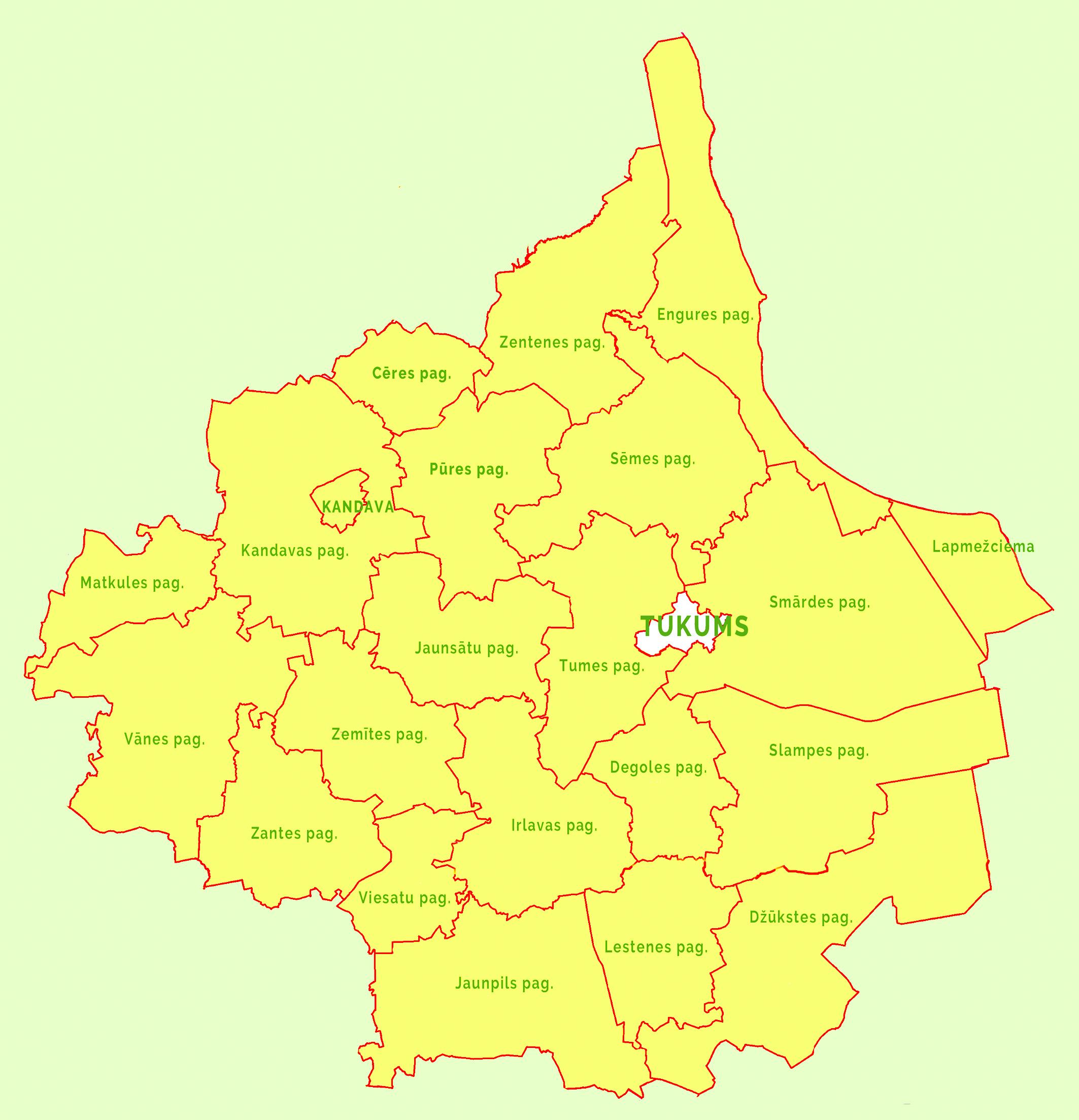 Un tātad – Tukuma novads būs ar administratīvo centru Tukumā,  kurā ietilpst Cēres pagasts, Degoles pagasts, Džūkstes pagasts, Engures pagasts, Irlavas pagasts, Jaunpils pagasts, Jaunsātu pagasts, Kandavas pagasts, Kandavas pilsēta, Lapmežciema pagasts, Lestenes pagasts, Matkules pagasts, Pūres pagasts, Sēmes pagasts, Slampes pagasts, Smārdes pagasts, Tukuma pilsēta, Tumes pagasts, Vānes pagasts, Viesatu pagasts, Zantes pagasts, Zemītes pagasts un Zentenes pagasts.