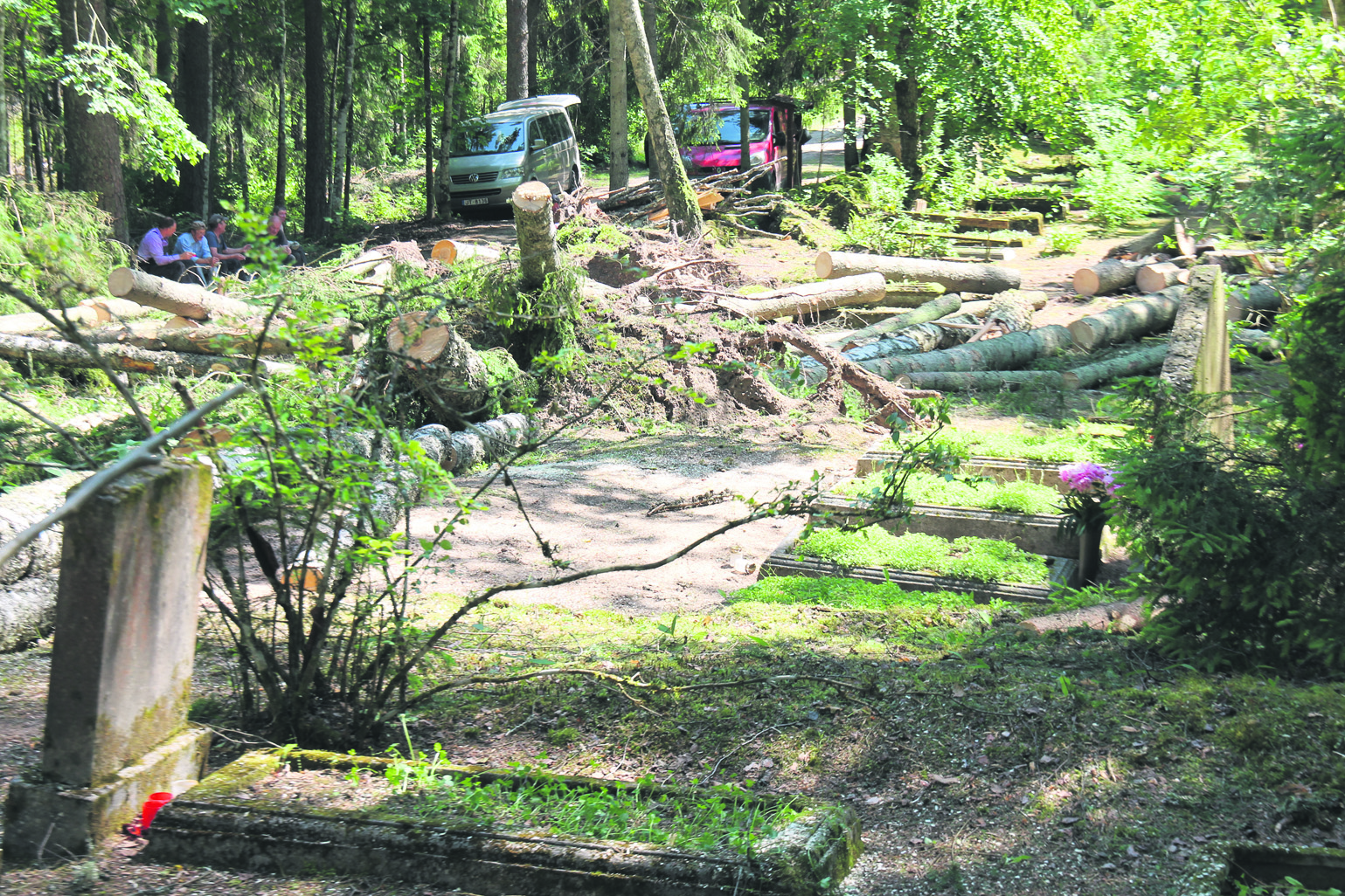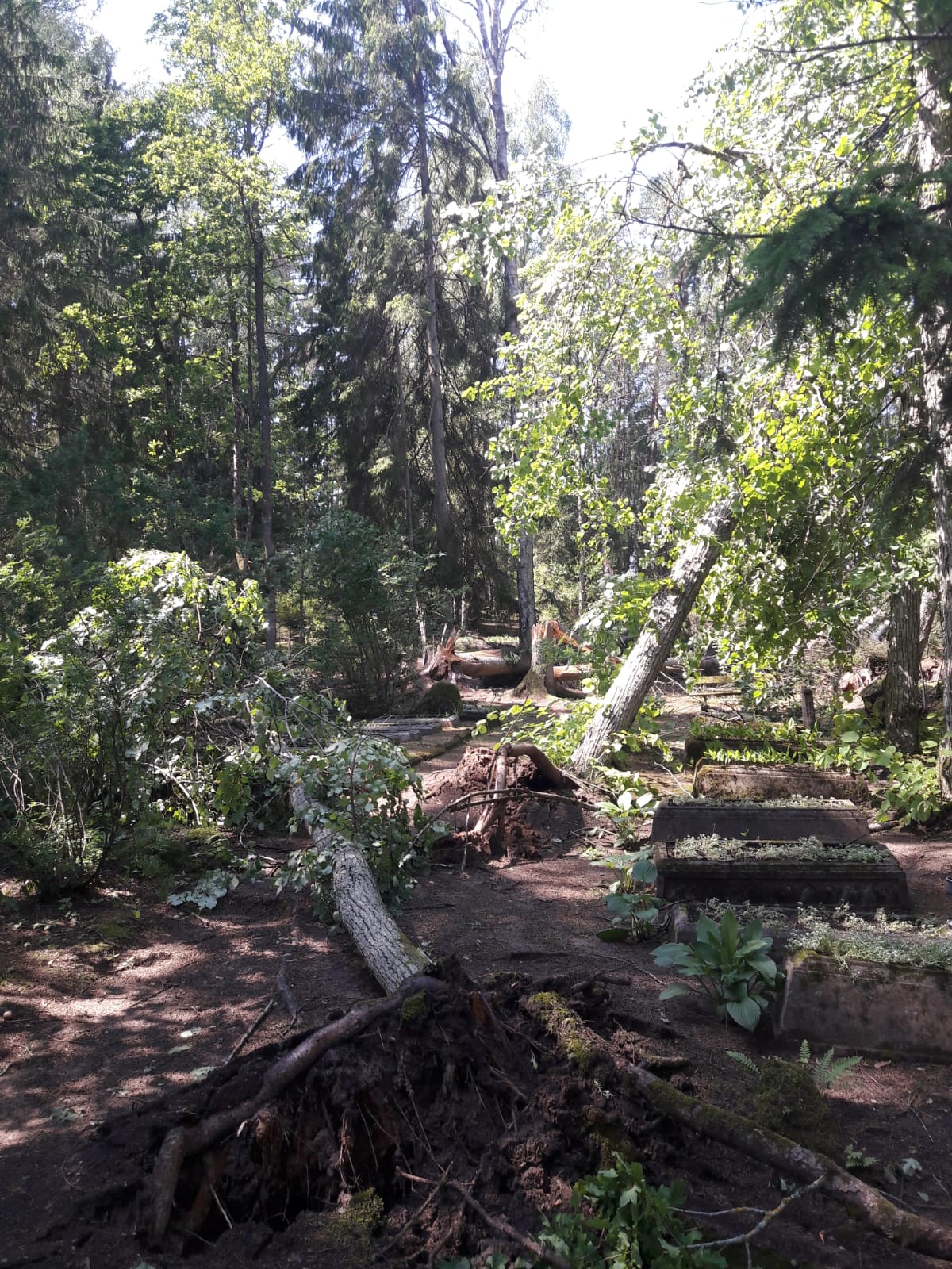 Kā stāstīja Sēmes un Zentenes pagastu pārvaldes vadītāja Silvija Rabkēviča, pirmais iespaids, ieraugot dabas stihijas radīto postažu, bijis dramatisks: “Lieli koki bija sagāzti krustu šķērsu gan kapos, gan blakus esošajā valsts mežā. Daļa no tiem izrauta ar visām saknēm. Šobrīd esam sākuši atbrīvot ceļu no vecajiem uz jaunajiem kapiem, kā arī pašus kapus, kuros, par laimi, neviens piemineklis nav cietis – tā laimīgi sagadījies, ka koki krituši tiem blakus. Patlaban kapos stādā SIA «Komunālserviss Tilde» trīs brigādes no Sēmes, Tumes un Slampes, lai iespējami ātrāk kokus no kapiem varētu aizvākt un vienlaikus atbrīvot arī ceļu.”