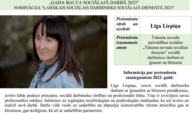 balva sociālajā darbā 2023» nominantiem. To vidū arī Tukuma novada pārstāve |