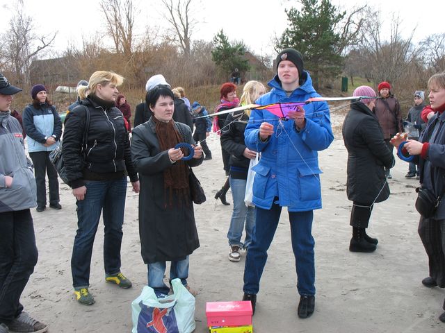 Lai otro Lieldienu rīts varētu sākties pa īstam, tautas dziesmu un parašu zinātāji Līga Cvetkova, Hercmaņu ģimene un Arnolds Lapiņš aicināja nodziedāt pasākuma dalībniekus Lieldienu dziesmu. Bet pēc tam, atbalsta grupas dalībnieces Agitas Stutiņas mudināti, ķērās klāt trim nopietniem uzdevumiem. Vispirms lapas vienā pusē bija jāuzraksta visas sliktās ziņas, bet otrā – visi labie sapņi un jāieliek laiviņā, ko palaist jūriņā. Lai būtu pilnīgi droši, ka koši dzeltenā laiviņa neizskalosies krastā, viens no tēviem apāvās lielos zvejnieku zābakus un ienesa to labi dziļi jūrā. Ar nākamo uzdevumu tikt galā arī bija viegli – piesiet konfektēs diedziņus un sakarināt… eglītē. Kā nosprieda pasākuma dalībnieki – tās tikšot Lieldienu zaķim vai tikpat labi arī putniem… L. Cvetkova izstāstīja Lejaskurzemei raksturīgo putnu dzīšanas tradīciju. Tā kā ar vārdu putni apzīmējot arī laumas un raganas, ļaudis Lieldienu rītā pulcējušies mežā un tad ar vārdiem: "Tiš, vārnas, kraukļi, pūces, vanagi un citas nelaimes," skrējuši uz jūrmalu un visas nelaimes dzinuši prom. To izdarīja arī šai reizē.