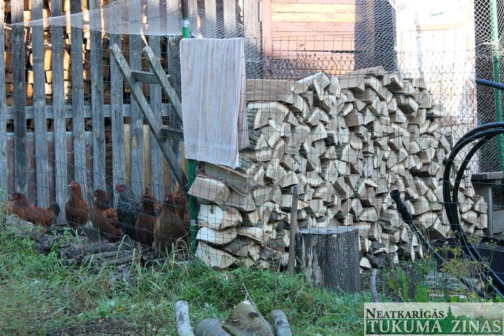 Posta darbs izdarīts turpat netālu no dzīvojamās mājas – vietā, kuru skatam no malas aizsedz gara zāle, sausi latvāņu stumbri un krūmi. Tajos tad arī iekritis zaļojošā koka stumbrs, kura zarus joprojām rotā zīles. Daļa stumbra turpat aiz mājas sazāģēta klucīšos, daļa jau saskaldīta un sakrauta blakus mājputnu nožogojumam.