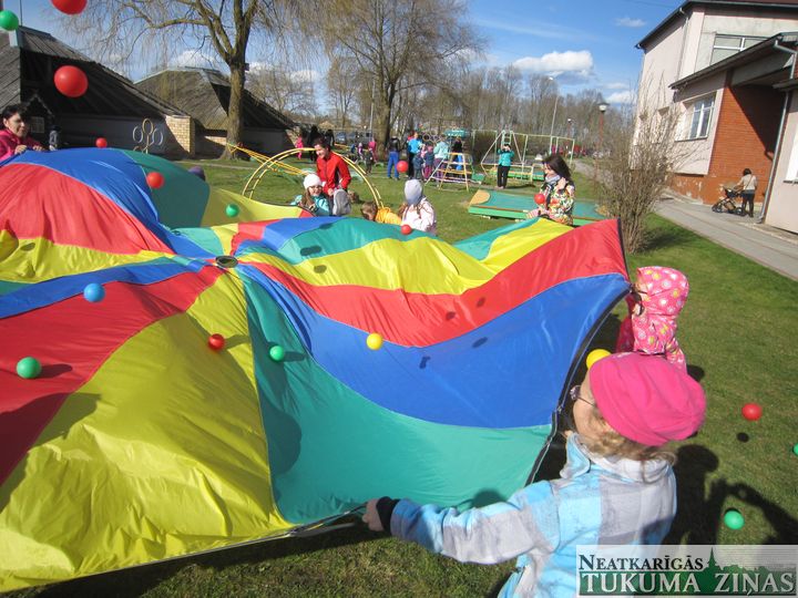Tukuma pirmsskolas izglītības iestādē «Taurenītis» 24. aprīlī notika pirmie Ģimeņu sporta svētki. Parasti audzēkņiem tiek rīkots pavasara un rudens sporta svētki, kuros mazāk nozīmīgi ir fiziski gūtie sasniegumi, rezultāti, svarīgākās ir kopīgi gūtās pozitīvās emocijas. Pēc pāris nedēļām Tukuma kultūras namā bērnudārzs svinēs Māmiņas dienu. Šoreiz Ģimeņu sacensībās dalībniekiem nācās pierādīt sevi visdažādākajās aktivitātēs – lecot ar maisu, veikli metot bumbiņas pāri tīklam vai spējā iespējami vairāk bumbiņu noturēt uz izpletņa. Dažs demonstrēja bumbas iesišanu vārtos, bija arī jautrās stafetes ar veļas žāvēšanu un citas atraktīvas nodarbes.