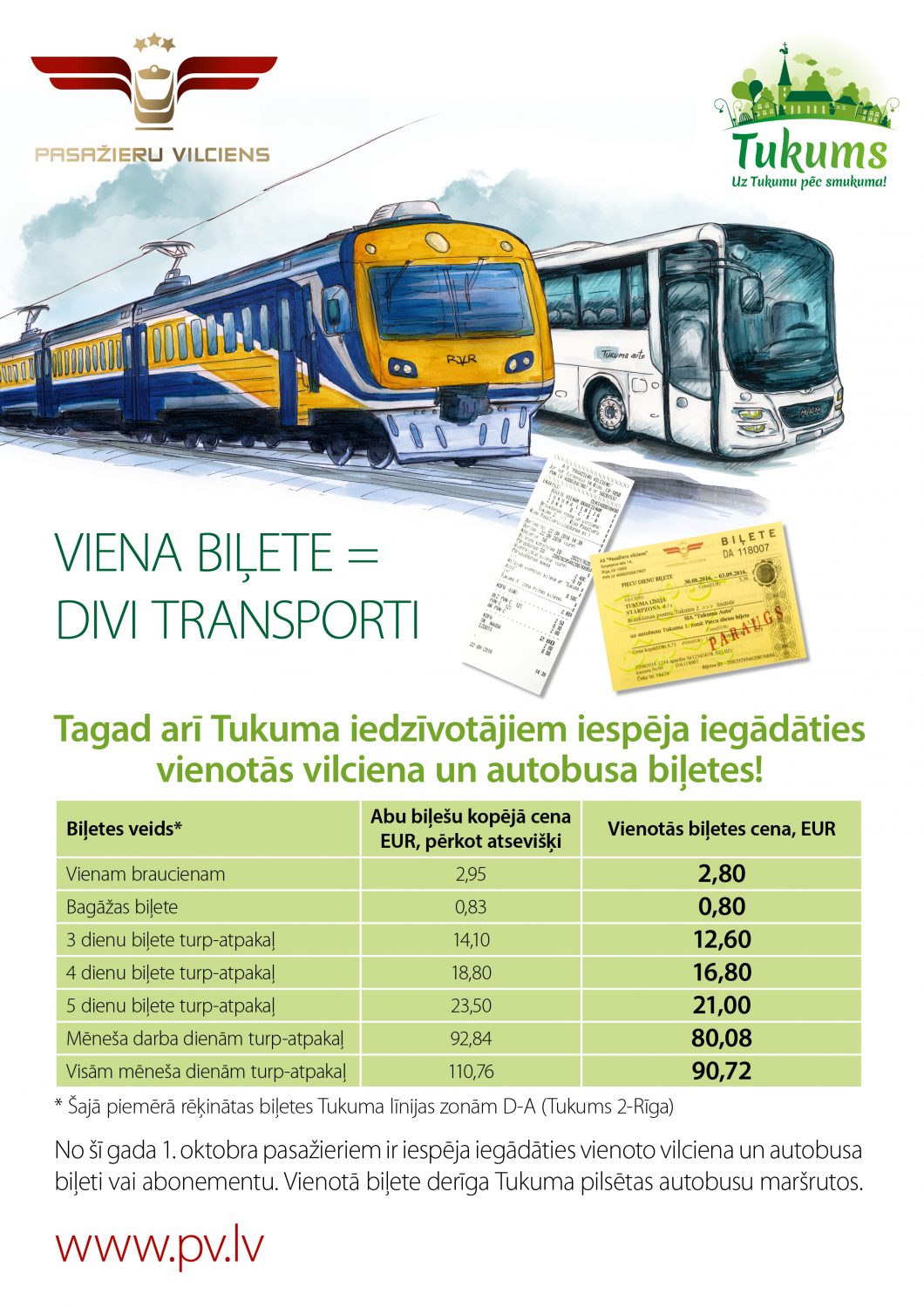 No 1. oktobra Tukuma novada iedzīvotājiem ir iespēja iegādāties vienoto biļeti, kas paredzēta braucienam ar diviem transportlīdzekļiem – autobusu un vilcienu. Pasažieris, iegādājoties biļeti vilciena biļešu kasē vai pie konduktora, varēs tikt no Rīgas līdz Tukuma stacijai ar vilcienu.