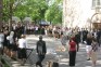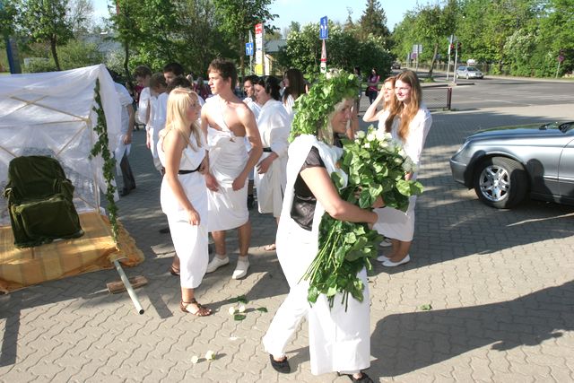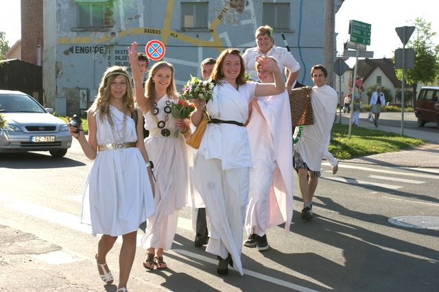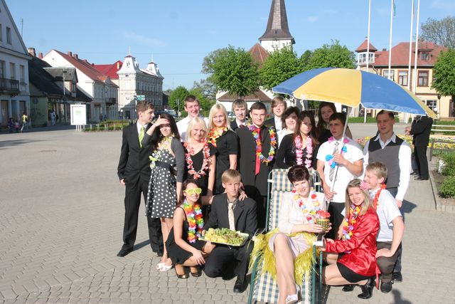 Vēlāk raiņi centrā pie strūklakas kopā ar skolotājām bildējās. Katru īpaši uz skolu aizveda. Zirga pajūgā, ar mocīti, bet, piemēram, skolotāju Initu Rudenko viņas puiši cauri pilsētai nešus aiznesa. Pie Tukuma 2. vidusskolas tāds pats ļembasts. Skolotājus nesa, veda ar veco, labo krievu «Volgu» un arī ar limuzīnu. Tukuma 2. pamatskolā šogad pirmais izlaidums. Devītie audzinātāju Agritu Auziņu līdz skolai atvizināja ar pašvaldības policijas automašīnu un, sirēnām kaucot, lai visi redz un zina, ka drīz atkal bērni kā putnēni no ligzdām izlidos. Mēs arī visu mūsu lasītāju vārdā novēlam skolēniem un viņu skolotājiem, vecākiem veiksmi eksāmenos un turpmākajā dzīvē.